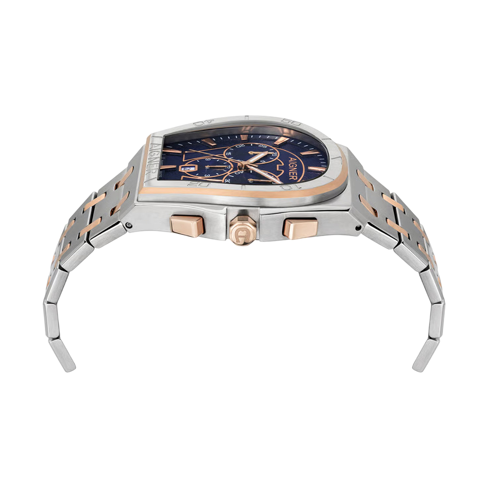 This contemporary men's watch by Aigner stands out with its rose gold stainless steel case and blue dial, encompassed in a 41 x 43 mm horseshoe-shaped case. The stainless steel bracelet features a butterfly buckle, providing a seamless and luxurious fit. Enhanced by sapphire glass, it runs on Swiss quartz movement, offers 5 ATM water resistance, and balances fashionable sophistication with robust functionality for modern professionals.