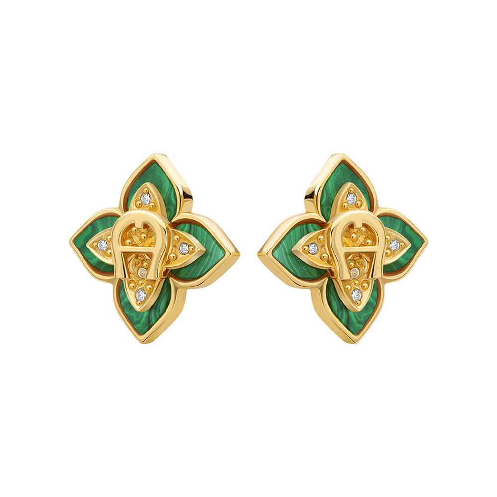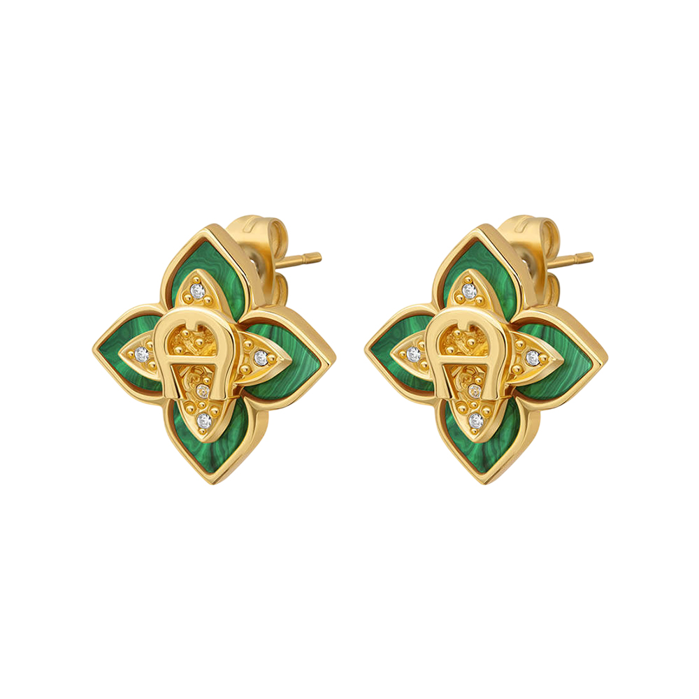 The AIGNER Flora Earrings ARJLE0003802 are a sophisticated addition to any jewelry collection, crafted from high-quality gold-toned brass. These stunning earrings showcase 15mm round malachite stones, renowned for their vibrant green hues and unique natural banding, capturing the essence of organic elegance. Part of the Flora collection, they are designed to add a fresh, nature-inspired touch to both daytime and evening ensembles. With their secure fit and timeless design, these earrings perfectly embody the Parisian luxury and contemporary style of AIGNER.