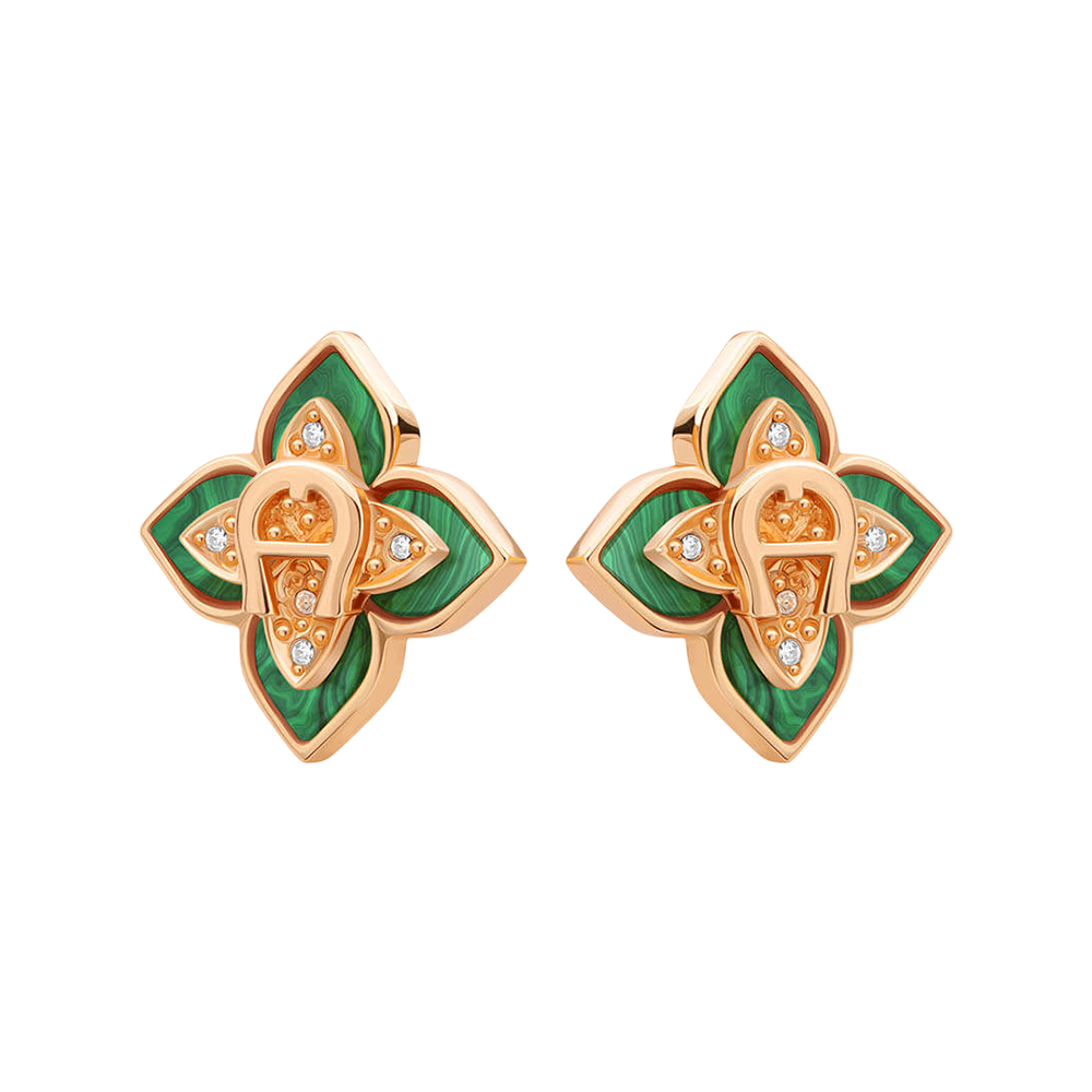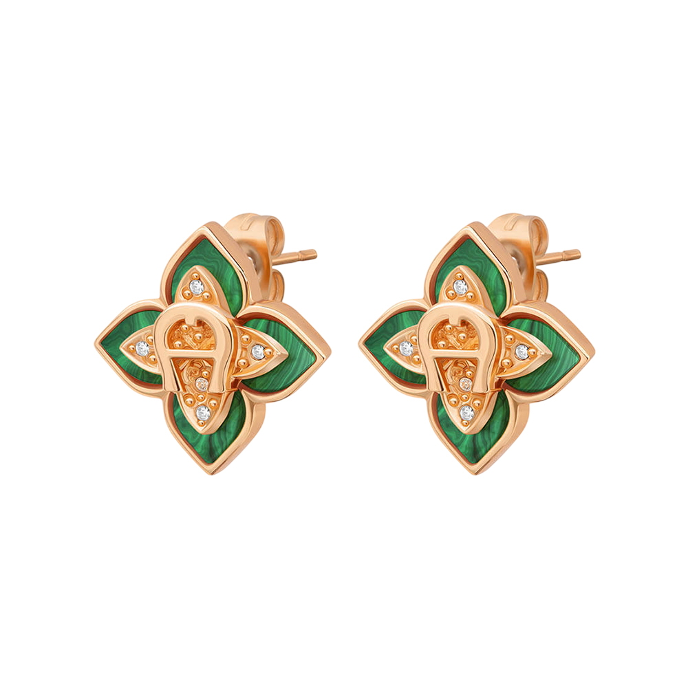 Part of the signature Flora collection, this 15mm stud earring is crafted from rose gold-plated brass and features a striking green malachite centerpiece. The iconic A-shaped logo motif frames the stone, providing a bold pop of color and a luxurious finish that is perfect for adding an element of nature-inspired elegance to any attire.