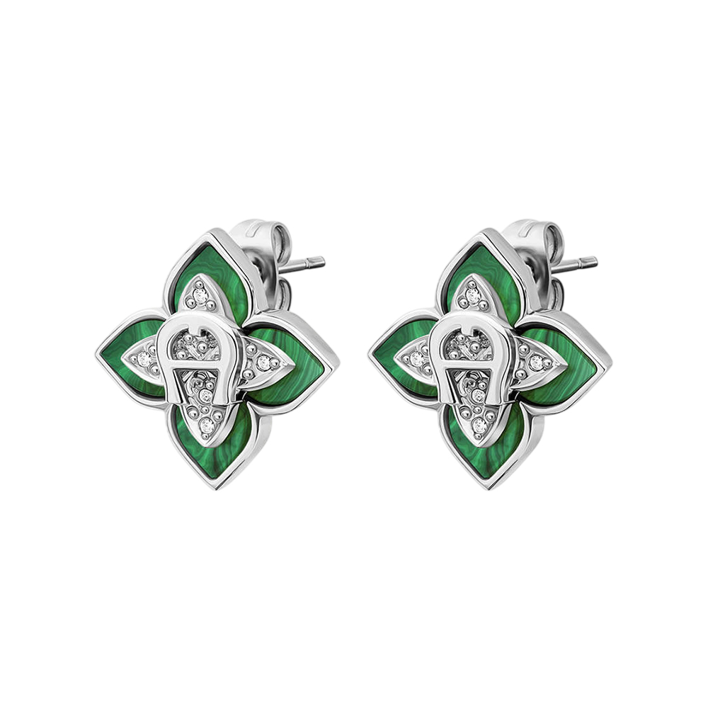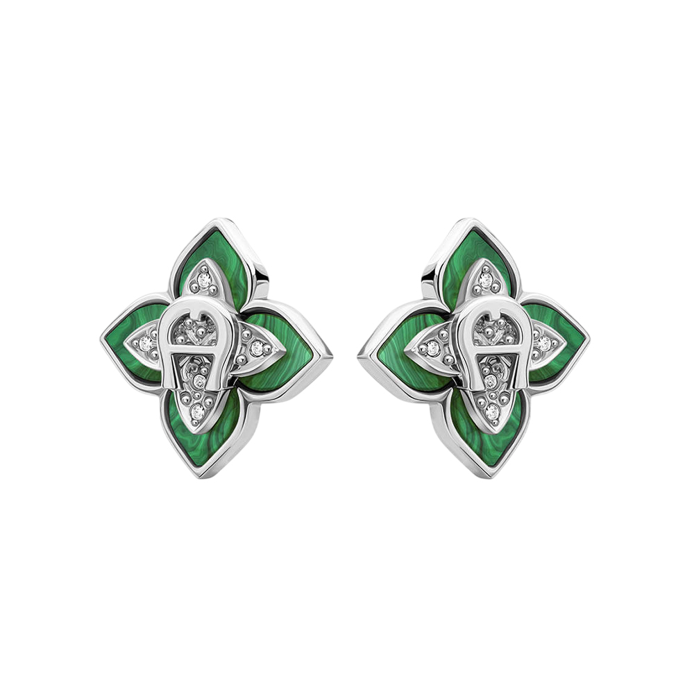 Crafted from polished brass and finished in a brilliant silver tone, these Flora stud earrings showcase a vibrant 15mm green malachite gemstone centerpiece set within the brand's logo motif. They are versatile, sophisticated, and perfect for the discerning woman seeking a blend of classic design and modern luxury.