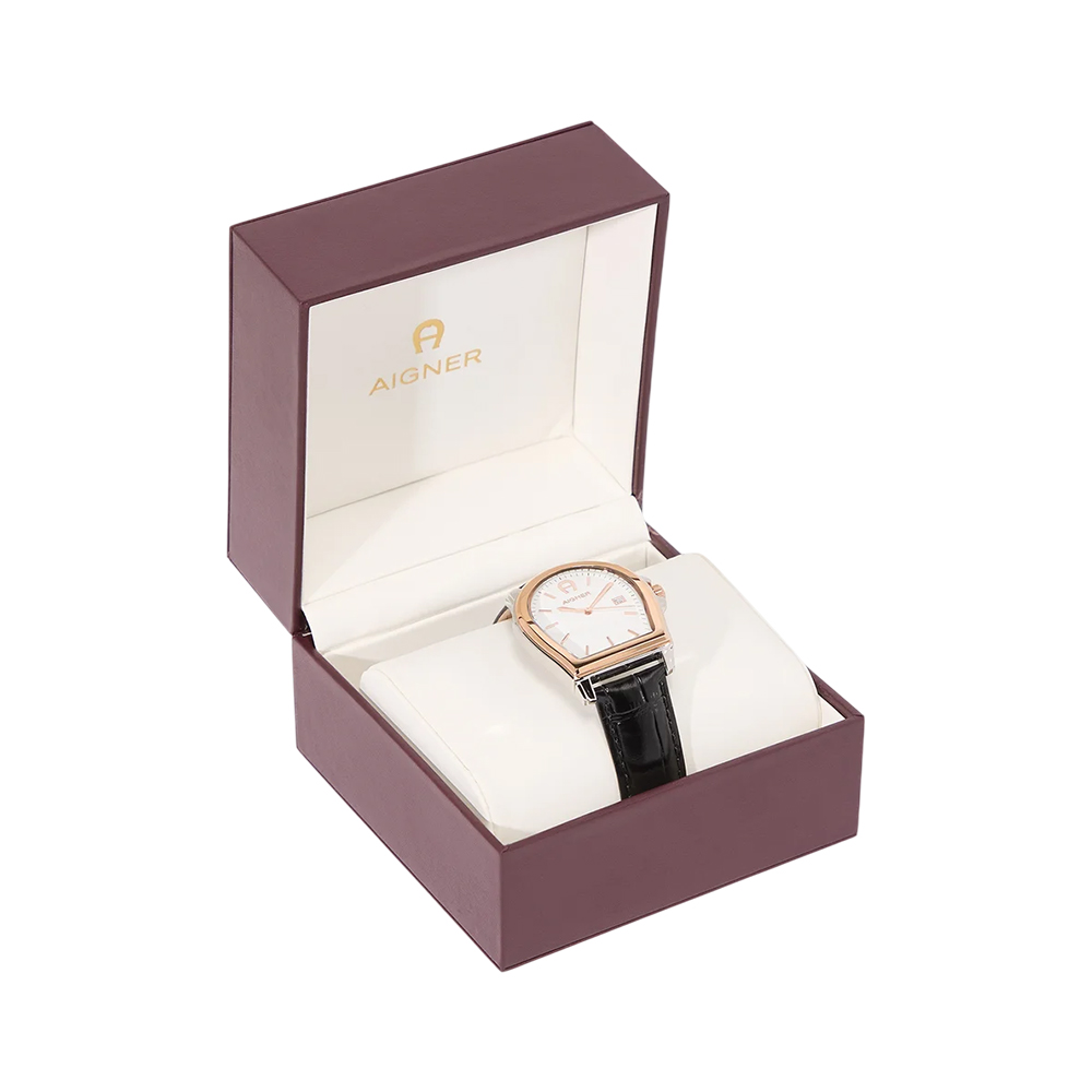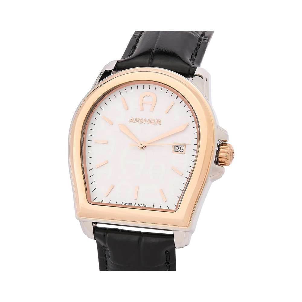 The AIGNER Watch ARWGA4810011 is a statement piece for the modern man, blending luxury heritage with contemporary design. This AIGNER timepiece features a unique 37 × 44 mm stainless steel case shaped in the brand's signature horseshoe emblem. The refined white analog dial is protected by durable mineral glass and is powered by a reliable quartz movement. The watch is secured by a black genuine leather strap with a classic tang buckle closure and offers 5 ATM water resistance, making this AIGNER watch both durable and stylish for all occasions.