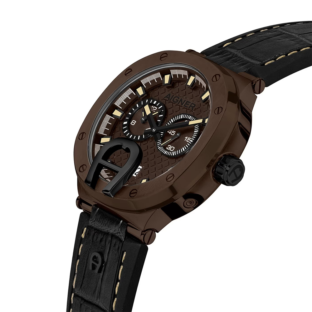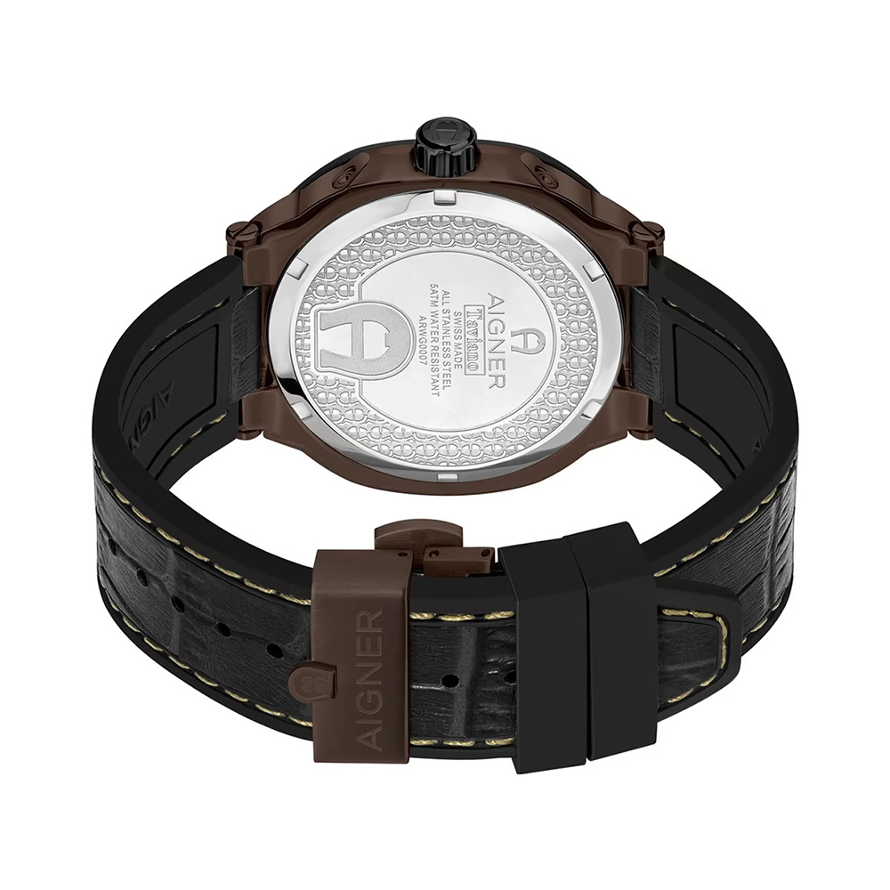 The Taviano by Aigner blends Swiss-made excellence and masculine elegance, featuring a bold brown dial and stainless steel brown case paired with a timeless black leather strap. Protected by mineral glass and engineered with reliable quartz movement, the 47mm round case elevates casual or formal looks. With 5 ATM water resistance and sophisticated form, it's designed for discerning men who value luxury craftsmanship and outstanding versatility in an exclusive timepiece.