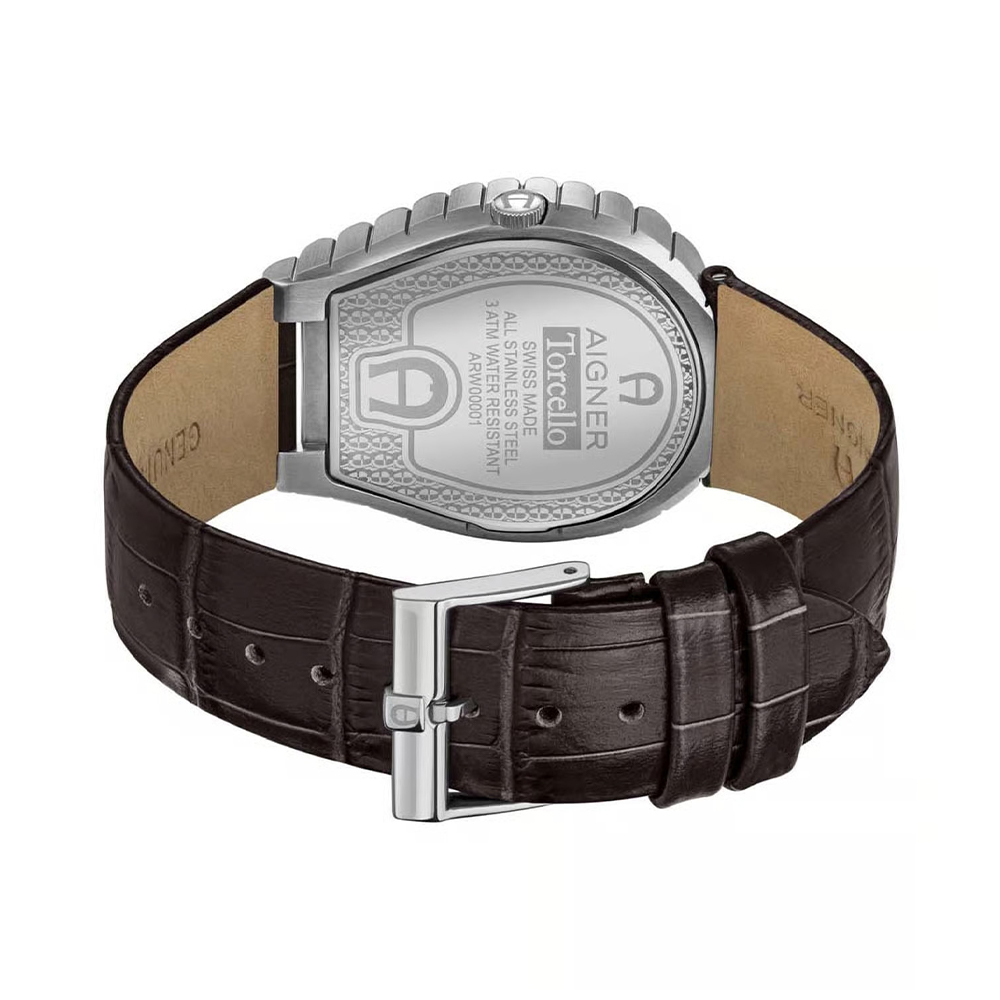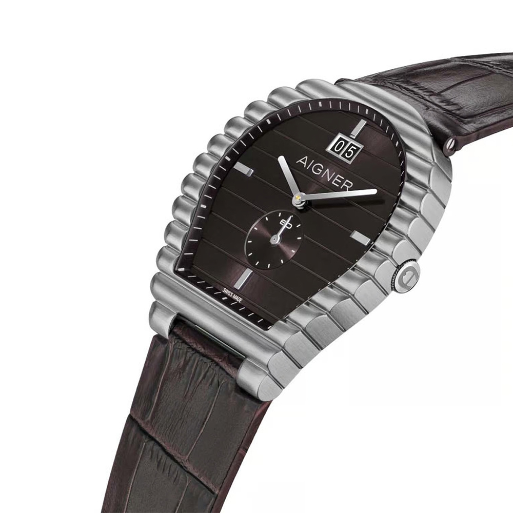Step into refined sophistication with the Aigner Torcello men's Swiss-made watch, designed for those who appreciate understated elegance. Showcasing a warm brown dial encased in a distinctively styled 40mm stainless steel horseshoe-shaped case, this timepiece pairs seamlessly with a premium brown leather strap. It ensures reliability through quartz movement, boasts a date feature, mineral glass durability, and water resistance up to 50M, becoming the definitive accessory for both business and leisure occasions.