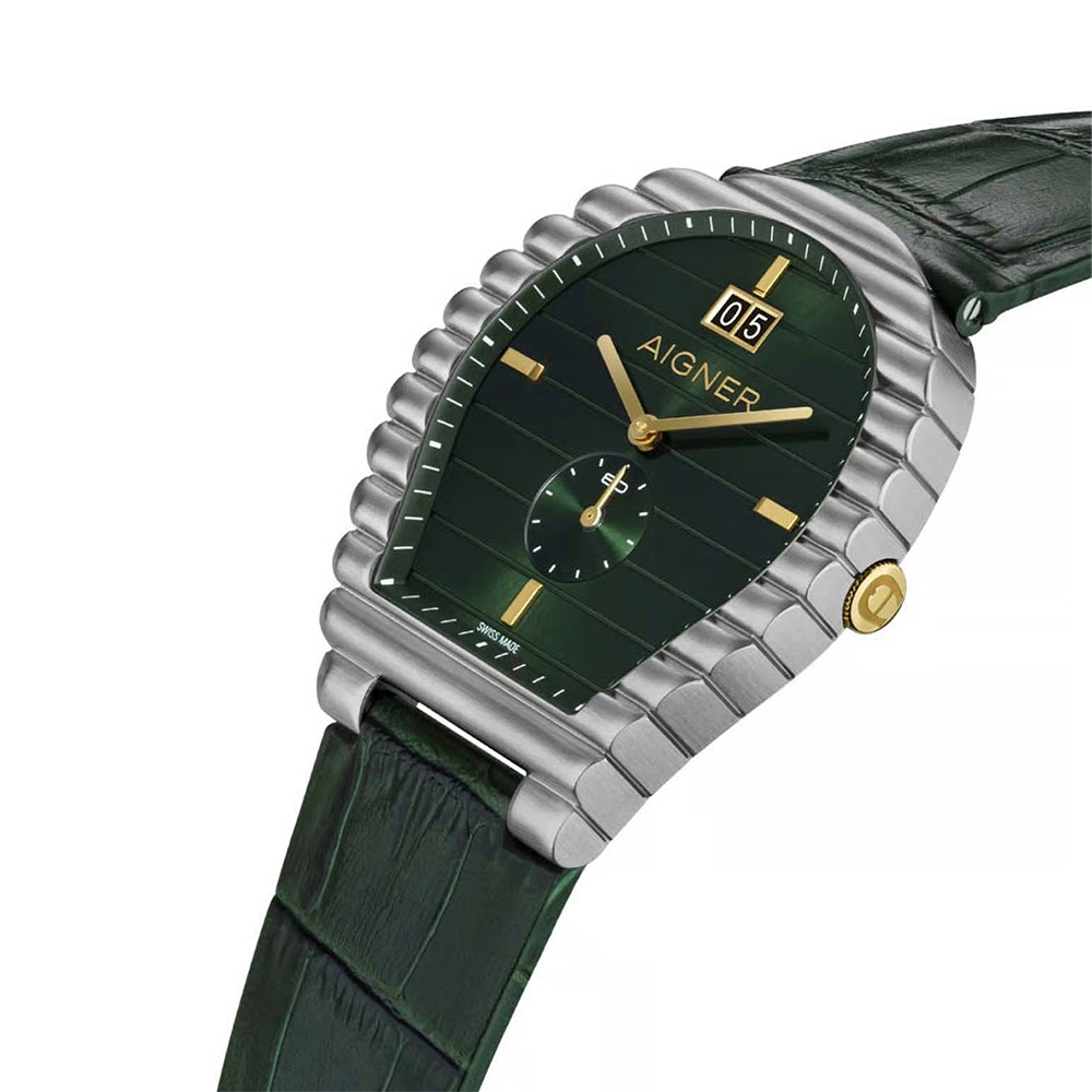 Embrace bold luxury with the Aigner Torcello men's Swiss-made watch featuring a striking green dial paired elegantly with a refined green leather strap. The 40mm case houses meticulous quartz movement, highlighted by tasteful minimalism and a date window for daily practicality. Suitable for formal and casual looks, this watch boasts a distinctive horseshoe-shaped case, mineral glass protection, and 50M water resistance, representing the perfect blend of iconic Aigner design and superior craftsmanship that elevates the modern man's wardrobe.