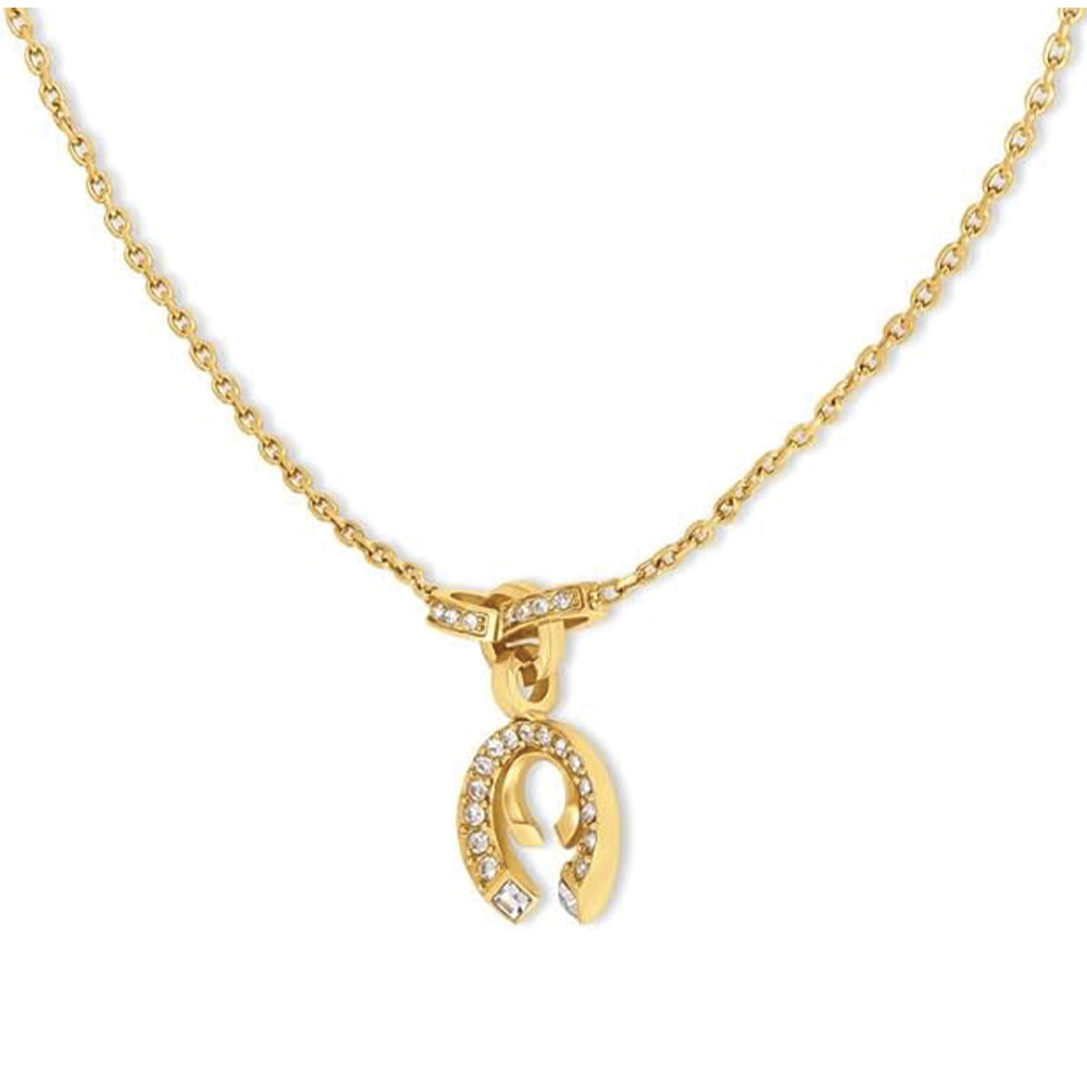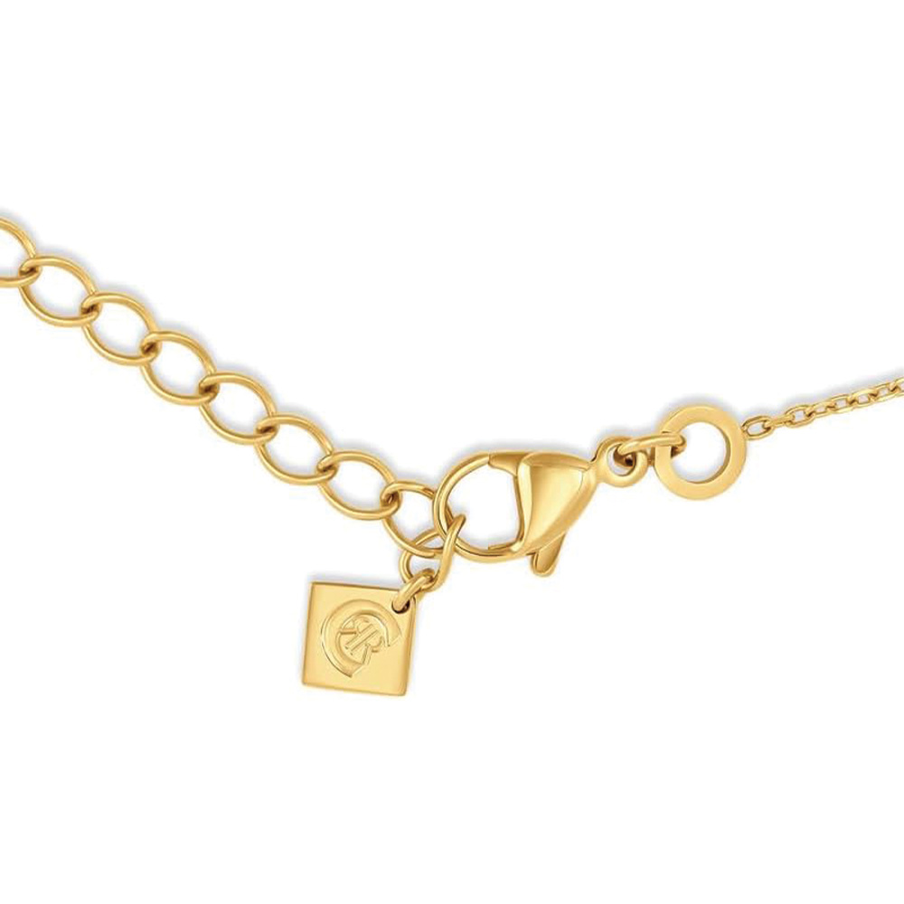 This Cerruti 1881 Amalia necklace features a polished gold-plated stainless steel construction with a distinctive double C pendant. The outer C is adorned with shimmering stones, while the inner C maintains a sleek finish, creating a balanced and modern design suitable for both casual and formal occasions.