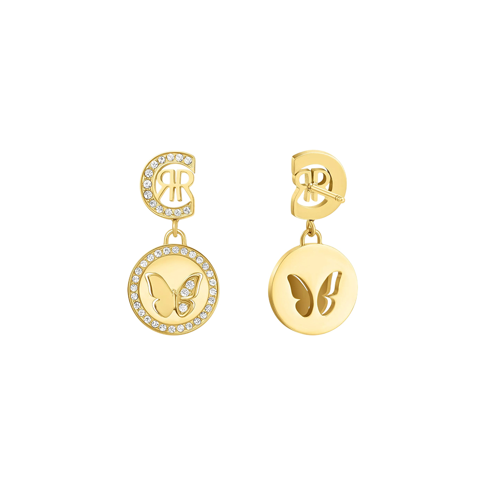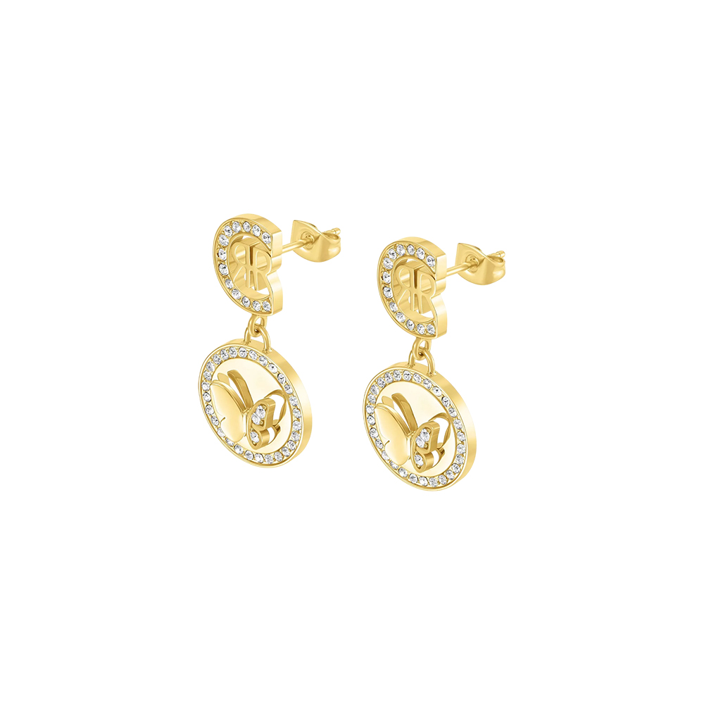 These sophisticated earrings from the Angela collection are crafted from durable stainless steel with an IP gold coating finish. They feature a stud clasp and a delicate butterfly motif accented with crystals. Measuring 12 mm in size, they are lightweight and perfect for adding a touch of natural charm and sparkle to both everyday and special occasions.