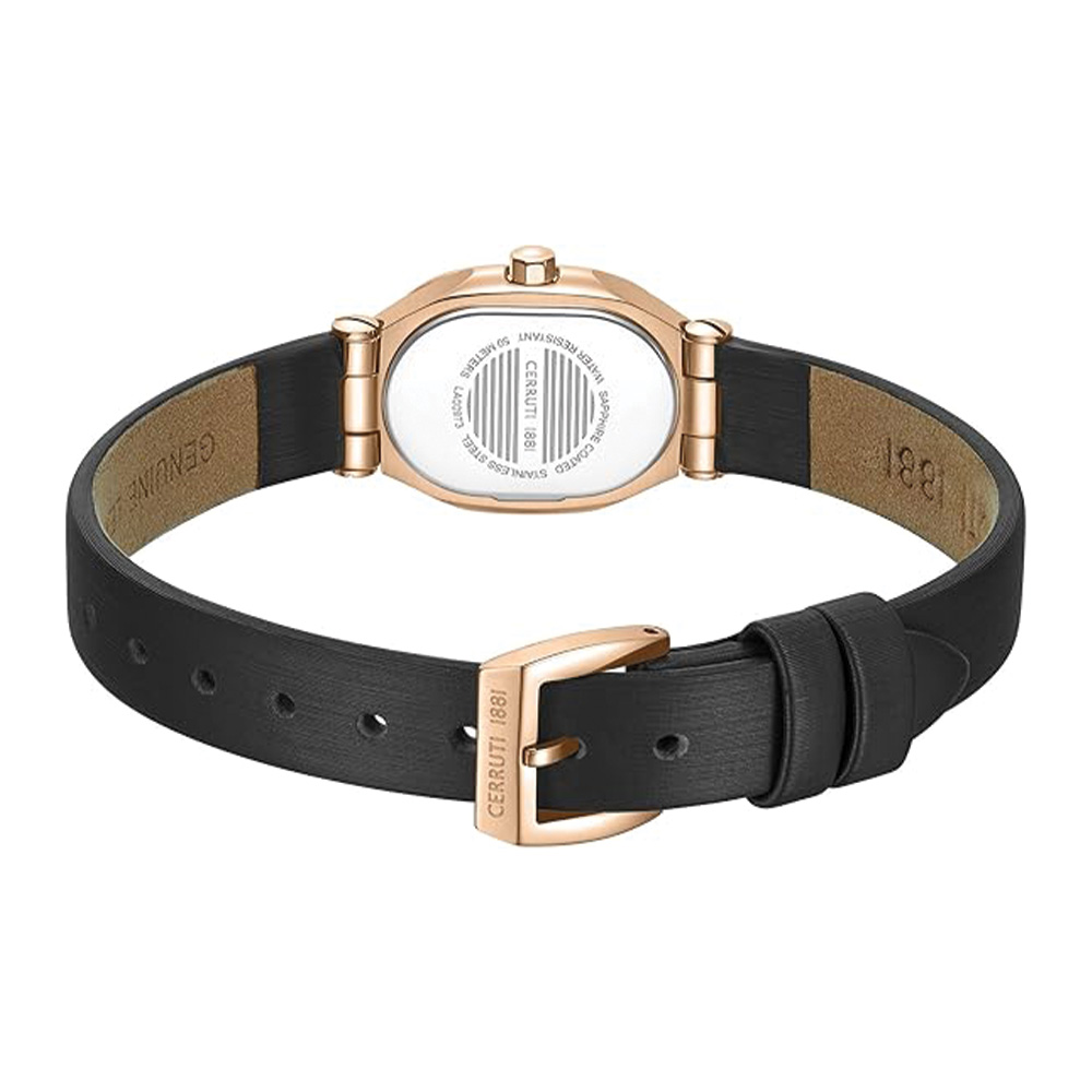 This Cerruti 1881 Aosta women’s watch features a compact 19mm case that delivers a delicate and sophisticated appearance. The rose gold-tone stainless steel case, accented with zirconia details, enhances its luxurious appeal. Paired with a sleek black leather strap, it offers both comfort and classic styling. Protected by mineral glass and powered by a reliable quartz movement, this two-hand analog watch ensures precise timekeeping. With water resistance up to 5 ATM, it is suitable for everyday wear while maintaining elegance.