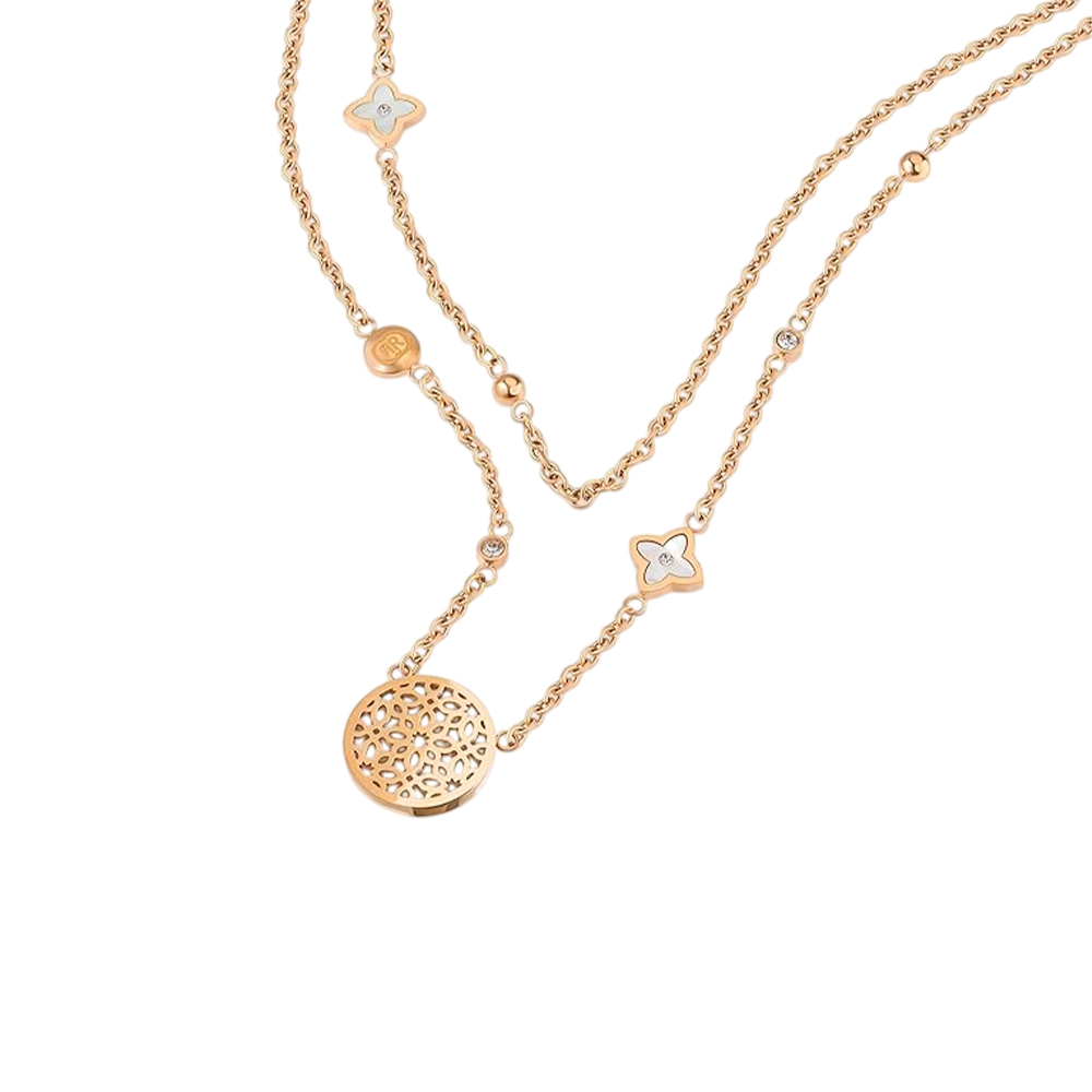 Part of the CERRUTI Arabesque collection, this sophisticated CERRUTI necklace is crafted from high-quality stainless steel with a warm rose gold plating. The design showcases a circular pendant with a natural mother of pearl base, overlaid with a delicate laser-cut arabesque motif. Suspended on a refined adjustable chain, this CERRUTI necklace blends traditional oriental aesthetics with modern French luxury, providing a radiant and elegant finish to any ensemble.