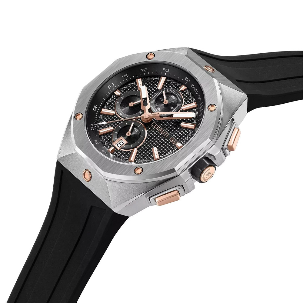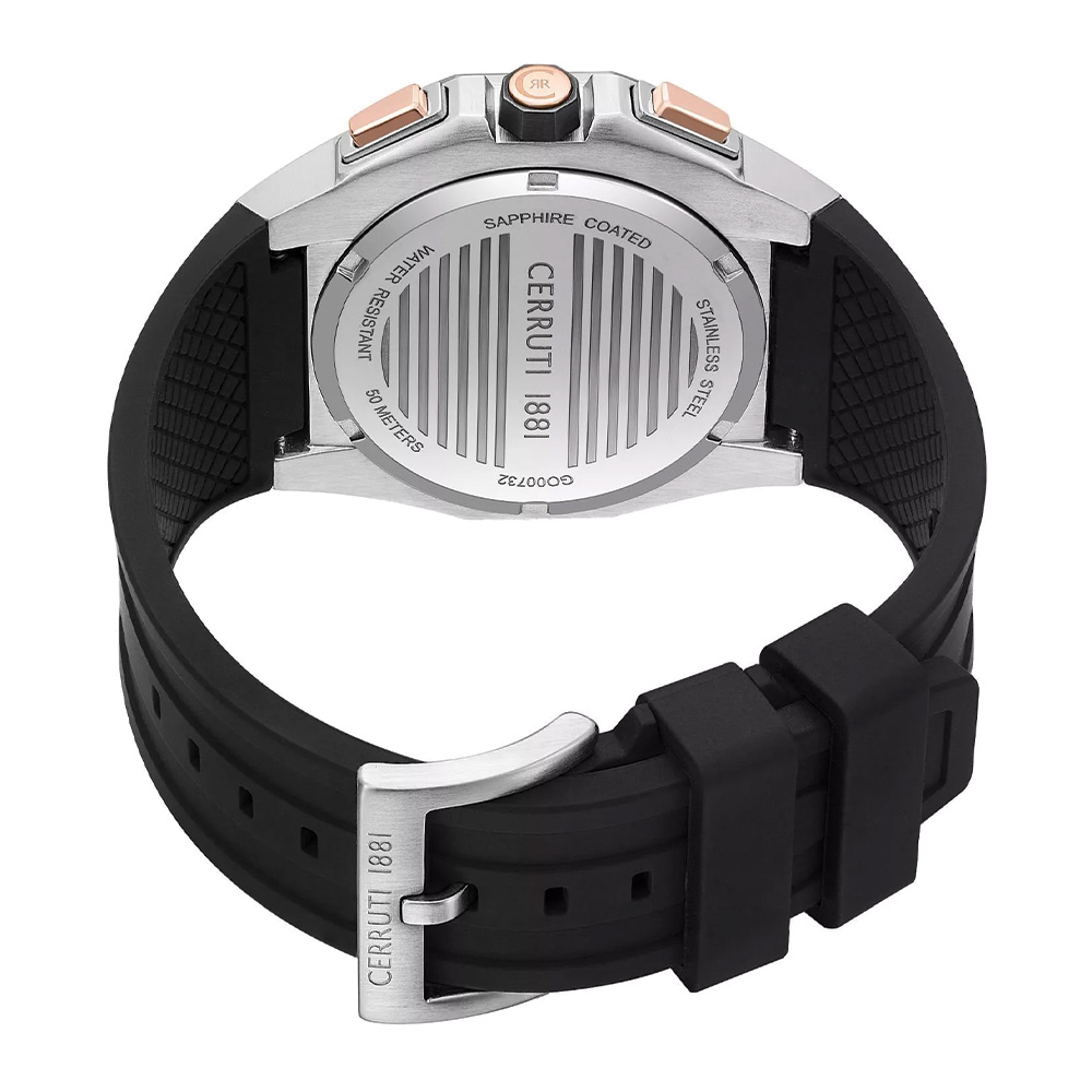 This Cerruti 1881 Arezzo men’s watch features a bold black dial that enhances its sleek and contemporary look. The 43mm stainless steel case delivers a strong wrist presence, while the black silicone strap ensures comfort and durability for daily wear. Protected by mineral glass and powered by a reliable quartz movement, it offers accurate timekeeping with minimal maintenance. With water resistance up to 5 ATM, this watch is suitable for everyday use, making it a perfect blend of style and practicality.