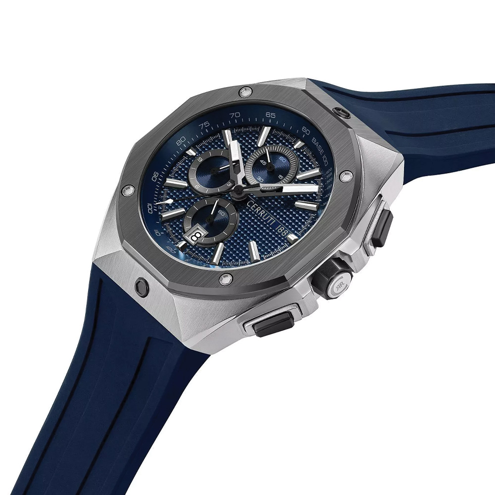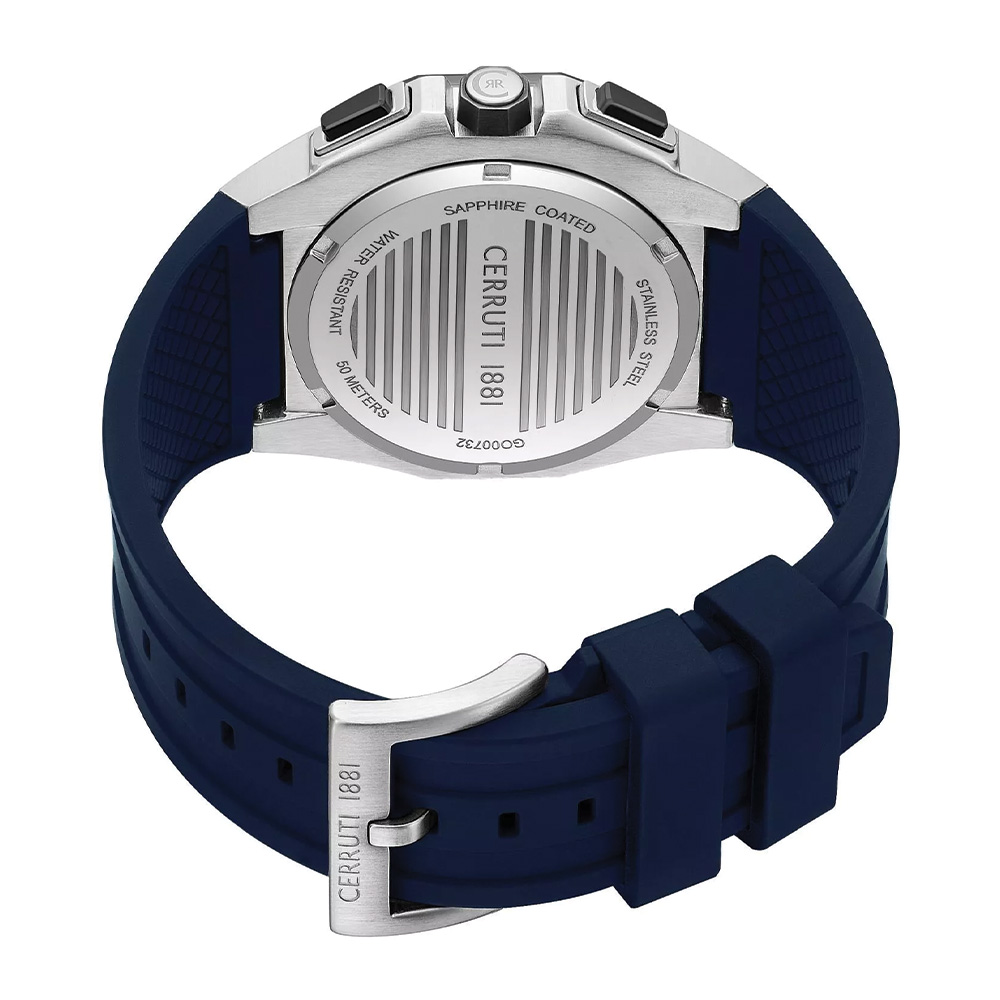 This Cerruti 1881 Arezzo Chronograph men’s watch features a striking blue dial that enhances its modern and sporty appeal. The 43mm stainless steel case provides a strong wrist presence, while the green silicone strap ensures comfort and durability for active lifestyles. Equipped with a precise quartz chronograph movement, it allows accurate time tracking along with everyday timekeeping. Protected by mineral glass and water resistant up to 5 ATM, this watch is ideal for daily wear with a dynamic and stylish edge.