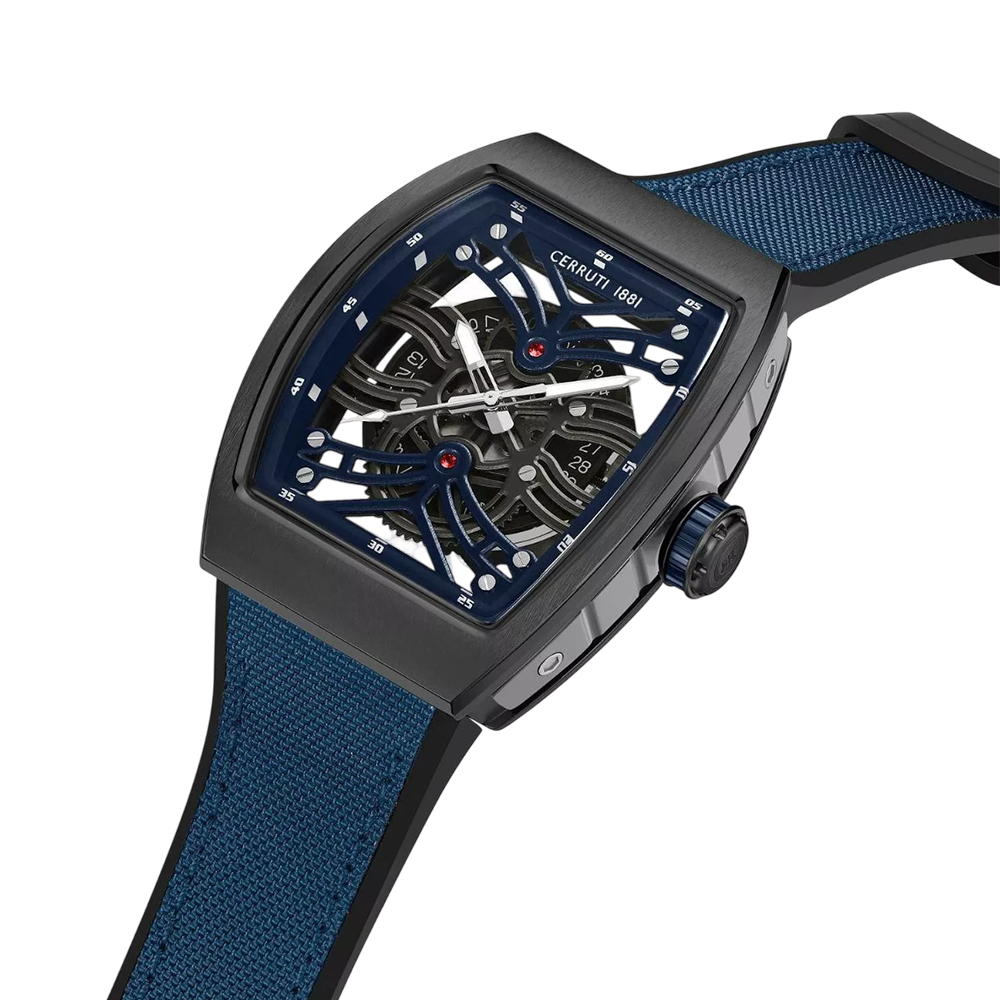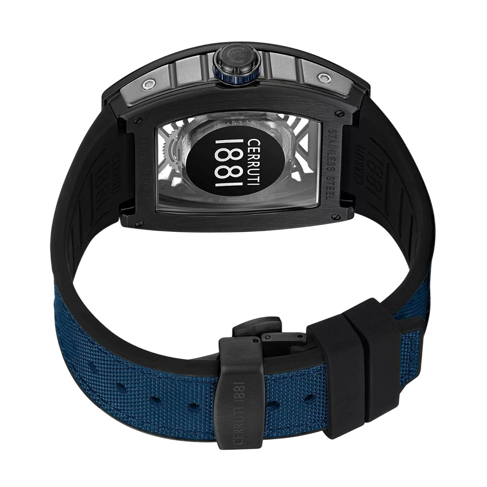 This striking timepiece from the Calliano collection offers a perfect blend of modern design and intricate detail. It operates on a reliable 2115-20P quartz movement, with the transparent dial offering a glimpse into the mechanism and featuring a practical date window. The durable black IP-coated stainless steel case is protected by scratch-resistant sapphire glass, while the navy blue rubber strap ensures comfort and a secure fit with a buckle clasp. With 50 meters of water resistance, this watch is an ideal choice for the modern man who values unique style and functional precision.