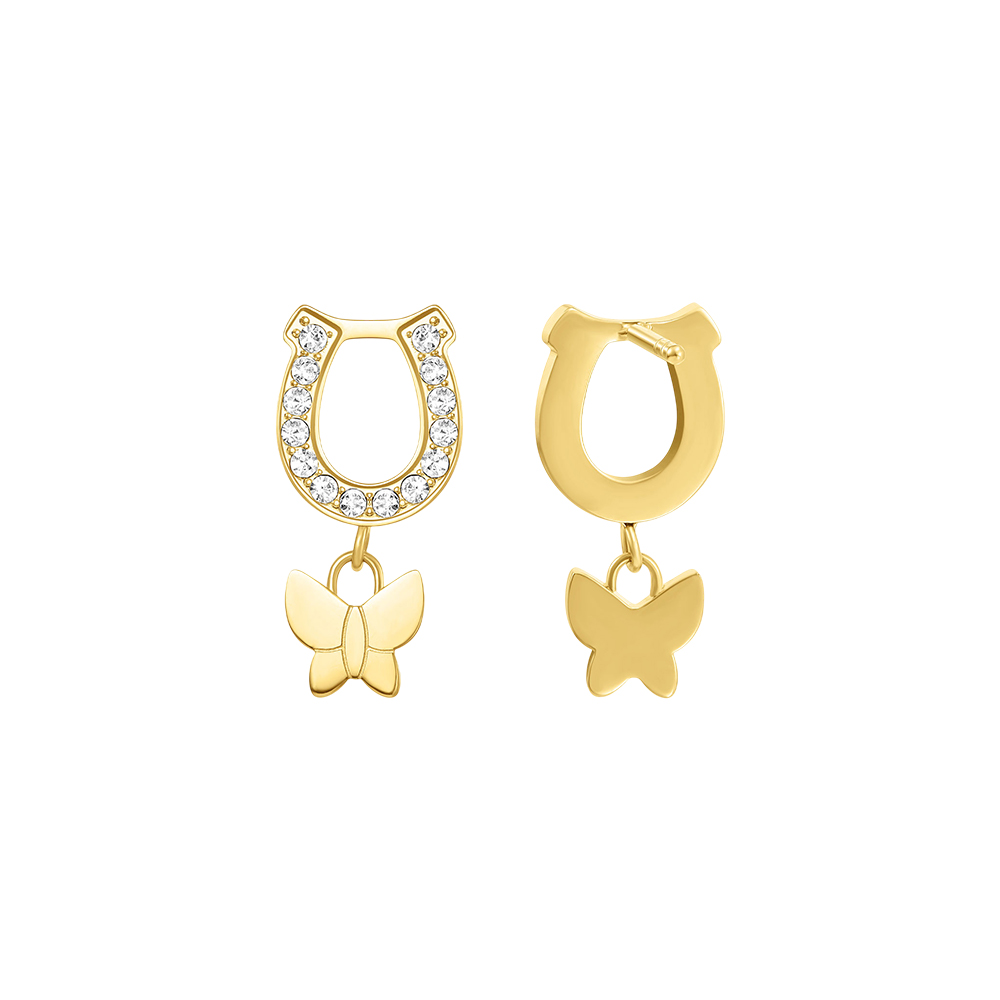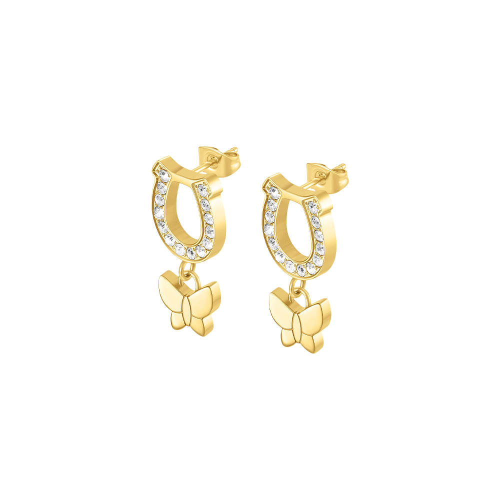 Part of the CERRUTI Carlotta collection, these CERRUTI earrings offer a delightful combination of luck and luxury. Crafted from high-quality stainless steel with a polished gold plating, the design features a symbolic horseshoe motif meticulously embedded with sparkling crystals. A graceful butterfly charm drops from the base, adding movement and a feminine touch. These CERRUTI earrings blend Italian elegance with contemporary style, making them a perfect statement piece for special occasions or a meaningful gift.