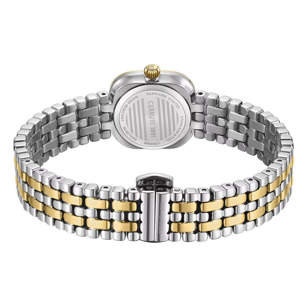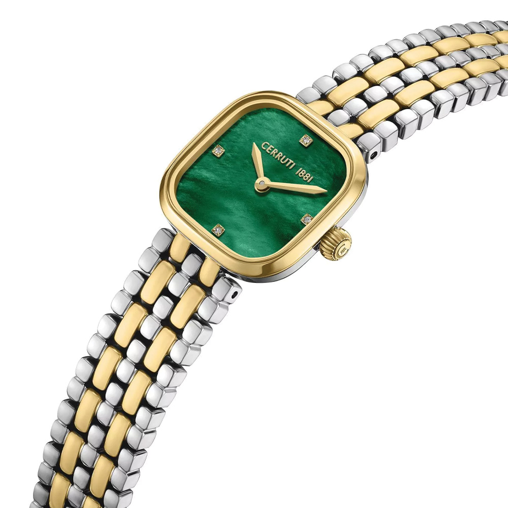 This Cerruti 1881 Casena women’s watch features a 26mm square stainless steel case in a sophisticated silver and gold tone, offering a delicate and elegant appearance. The green mother-of-pearl dial adds a luxurious shimmer, enhancing its feminine appeal. Paired with a matching dual-tone stainless steel bracelet, it ensures both comfort and timeless style. Protected by mineral glass and powered by a reliable quartz movement, it delivers accurate timekeeping. With water resistance up to 3 ATM, this watch is suitable for everyday wear while maintaining its elegant charm.