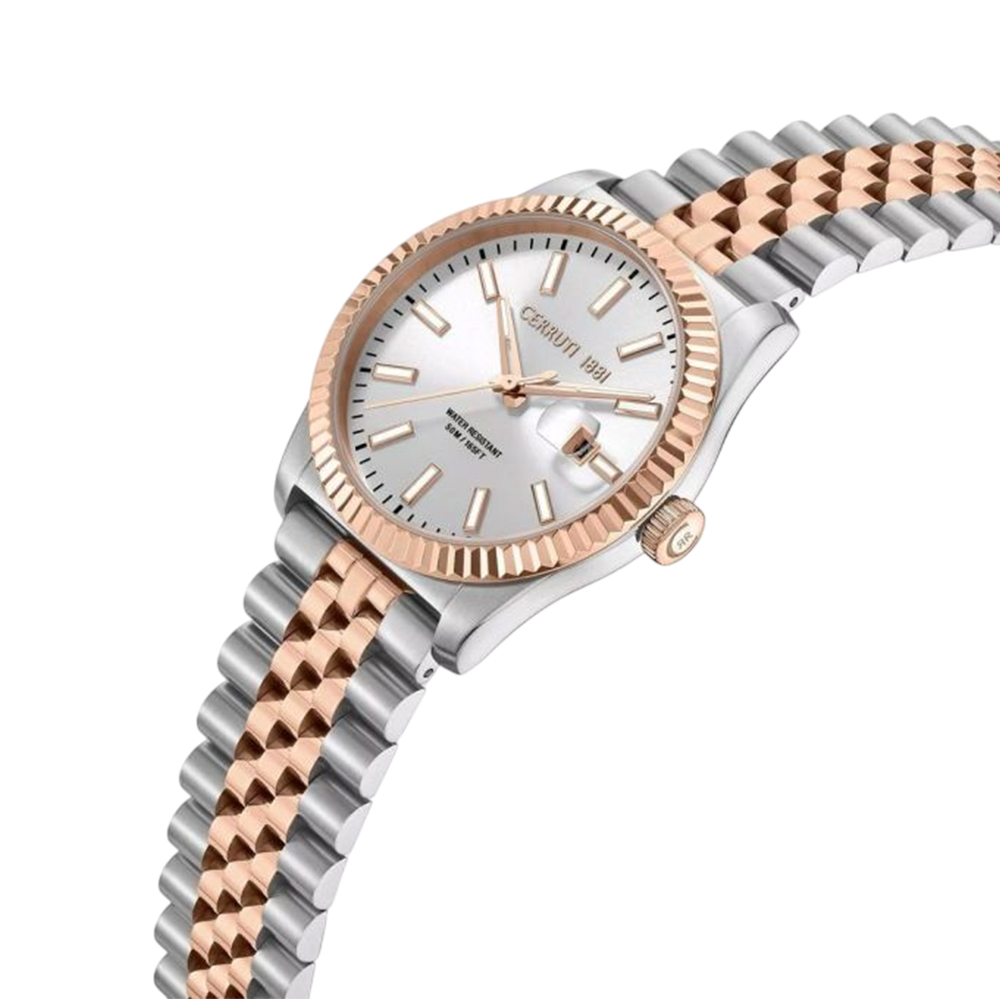 This timepiece from the Chienti collection combines modern design with practical functionality, making it an ideal choice for the contemporary man. It features a solid stainless steel case with subtle rose gold accents that frame a clean white dial, protected by durable mineral glass. Powered by a reliable quartz movement, the integrated silver / rose gold stainless steel bracelet ensures comfortable and stylish wear. With 100 meters of water resistance, this watch is suitable for everyday use and swimming, reflecting the Italian elegance and practicality of CERRUTI 1881.