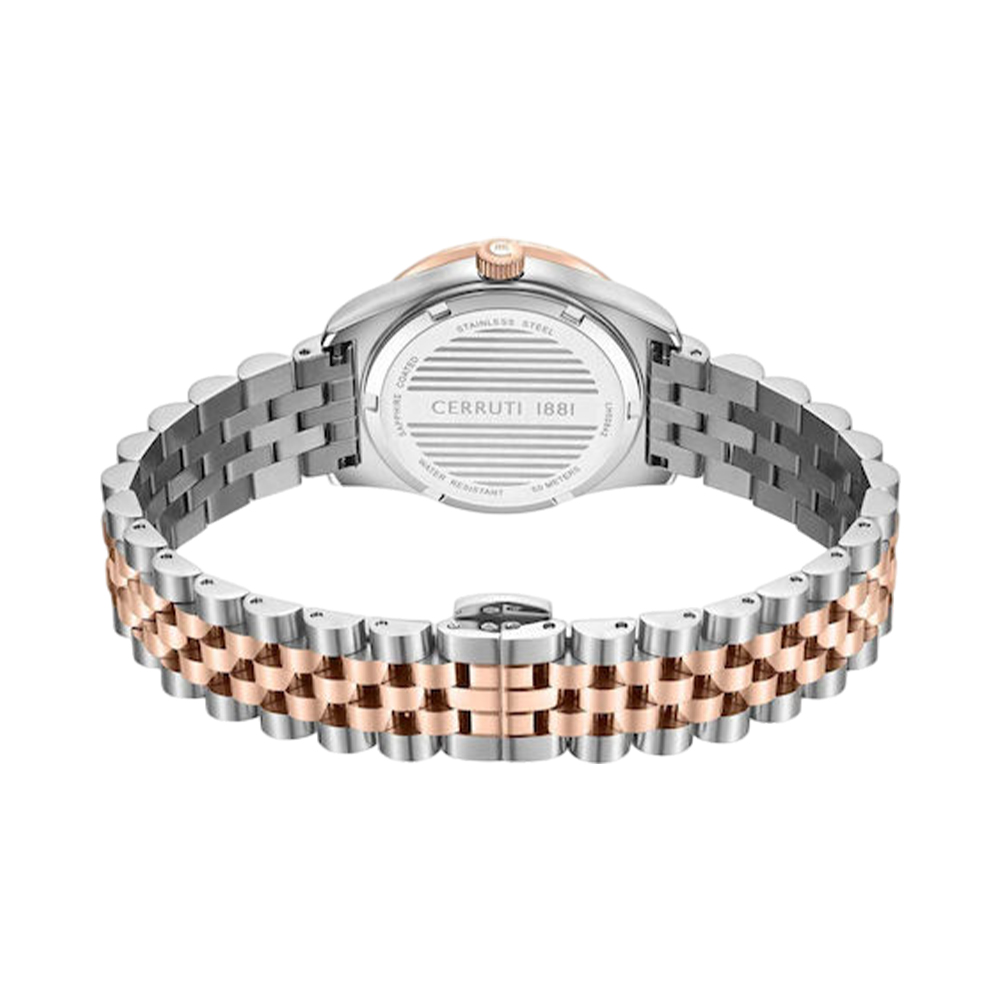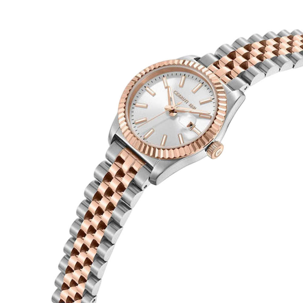 Combining Italian elegance with modern design, this CERRUTI timepiece from the Chienti collection offers reliable performance and a timeless character. The CERRUTI watch features a clean white analog dial housed in a round stainless steel case accented with pink gold plating. Powered by a precise battery-operated quartz movement and protected by durable mineral glass, this CERRUTI watch is completed by a sophisticated silver and pink gold-toned metal bracelet. This CERRUTI timepiece is a perfect blend of high-quality materials and refined aesthetics, making it an ideal accessory for the modern woman's wardrobe.