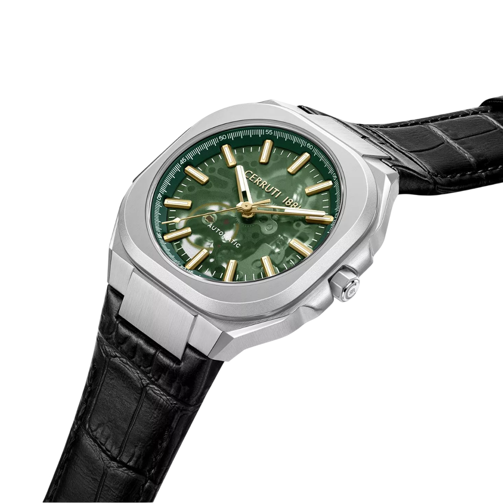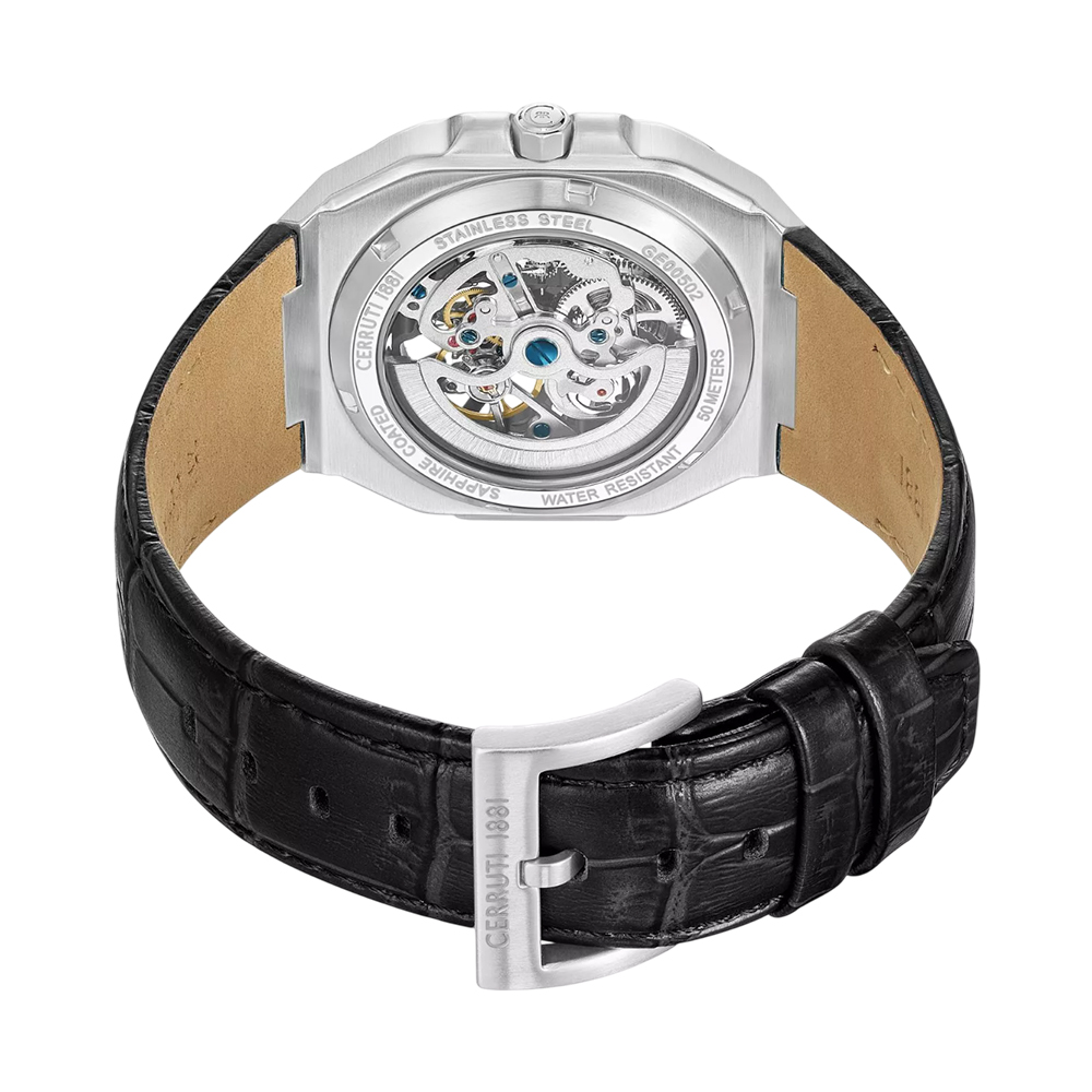 This unique timepiece from the Contemporary Skeleton collection combines classic elegance with modern design. The large 50mm silver stainless steel case frames an intricate transparent skeleton dial complemented by a unique translucent green glass, offering a view of the automatic movement within. The dial is protected by durable, scratch-resistant sapphire crystal, while the black genuine leather strap provides a comfortable fit and a classic aesthetic. With 50 meters of water resistance, this watch is a statement piece suitable for both daily wear and special occasions.