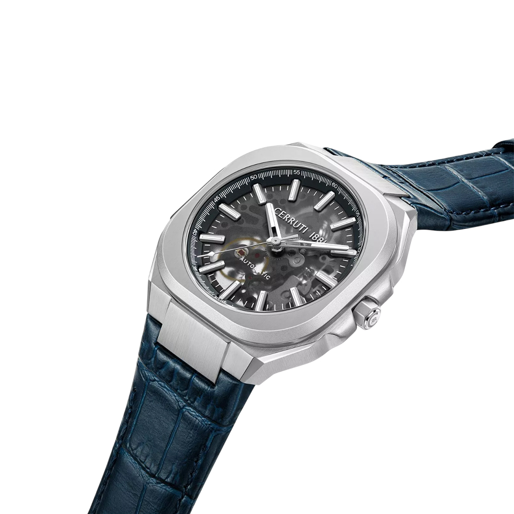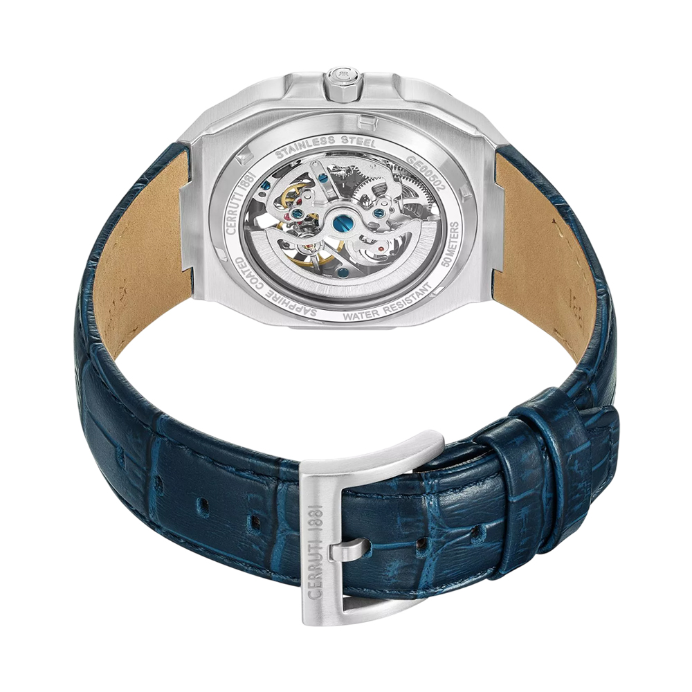 This unique timepiece from the Contemporary Skeleton collection combines classic elegance with modern design. The large 50mm silver stainless steel case frames an intricate transparent skeleton dial, offering a view of the precision automatic movement within. The dial is protected by durable, scratch-resistant sapphire crystal, while the navy blue genuine leather strap provides a comfortable fit and a classic aesthetic. With 50 meters of water resistance, this watch is a statement piece suitable for both daily wear and special occasions.