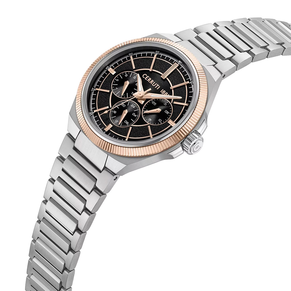 This Cerruti 1881 Faedo men’s watch features a sleek black dial that adds a timeless and refined touch to its design. The 42mm stainless steel case paired with a matching silver-tone bracelet creates a clean and sophisticated look suitable for both formal and casual wear. Protected by sapphire-coated mineral glass and powered by a reliable quartz movement, it ensures durability and precise timekeeping. With water resistance up to 5 ATM, this watch is ideal for everyday use while maintaining a stylish appearance.
