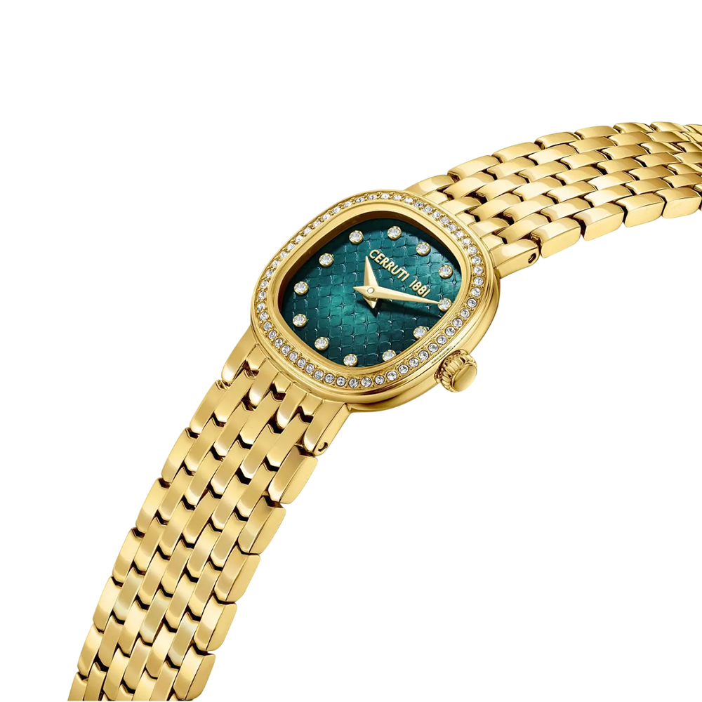 This sophisticated timepiece from the Gresta collection combines modern design with elegant style. It features a luminous green mother-of-pearl dial that catches the eye, protected by durable mineral glass. The 26mm stainless steel case with rose gold plating houses a reliable quartz movement. The integrated rose gold-toned brass bracelet perfectly matches the overall design, creating a delicate and feminine aesthetic. With 30 meters of water resistance, this watch is ideal for everyday elegance and refined occasions.