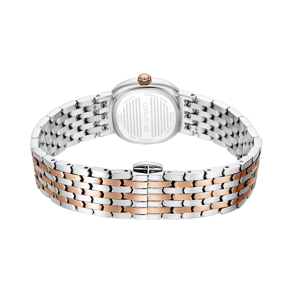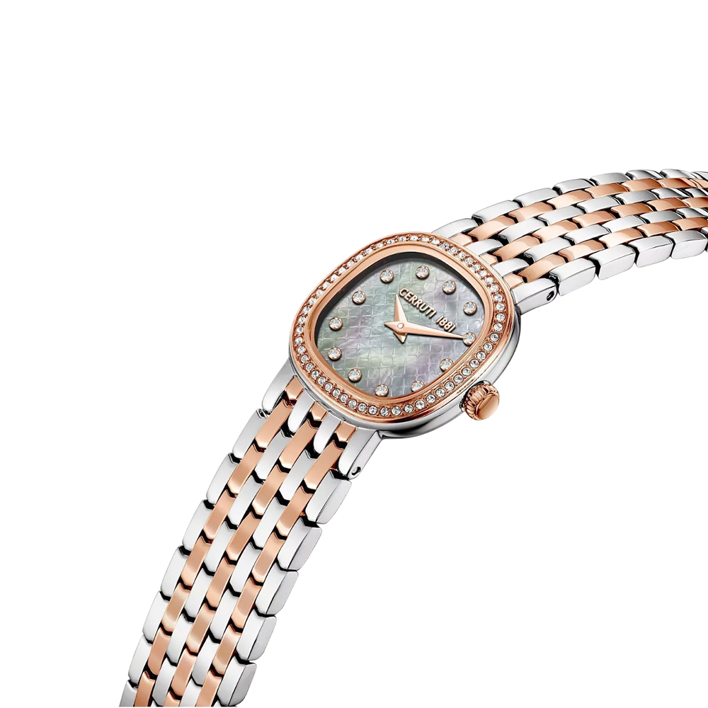 This sophisticated timepiece from the Gresta collection combines modern design with a classic finish. It features a luminous white mother-of-pearl dial, protected by durable mineral glass. The 26mm stainless steel case with rose gold plating houses a reliable quartz movement. The integrated two-tone brass bracelet creates a harmonious aesthetic, making the watch subtle and feminine. With 30 meters of water resistance, this watch is ideal for everyday elegance and refined occasions.