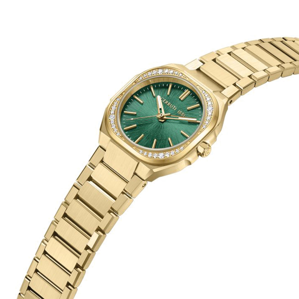 This Cerruti 1881 Leadri women’s watch features a striking green dial set within a sleek rectangular gold-tone stainless steel case, enhanced with zirconia detailing for added brilliance. The 32mm case offers a balanced presence, while the gold stainless steel bracelet delivers durability and a premium finish. Powered by a precise quartz movement with three-hand functionality, it ensures reliable timekeeping. Protected by mineral glass and water resistant up to 5 ATM, this watch blends modern elegance with everyday practicality.
