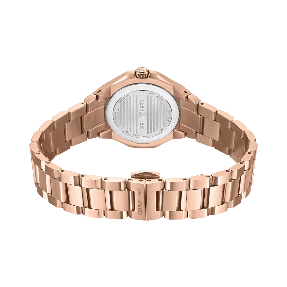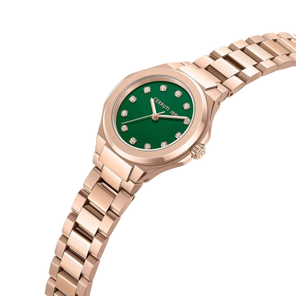 The Cerruti 1881 Lucardo for women showcases a 33mm rose gold stainless steel case, a refined green dial, and a flawless rose gold bracelet. With quartz movement, mineral glass, and 5 ATM water resistance, it's the definition of stylish Italian luxury for contemporary women.