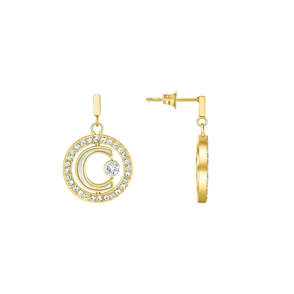 Part of the CERRUTI Marque collection, these sophisticated CERRUTI earrings capture the essence of luxury. They are meticulously crafted from high-quality stainless steel with a radiant gold plating. The design showcases a luminous mother-of-pearl inlay coupled with iconic CERRUTI branding and shimmering crystals. Lightweight and versatile, these CERRUTI earrings are designed to provide a comfortable fit for everyday elegance.