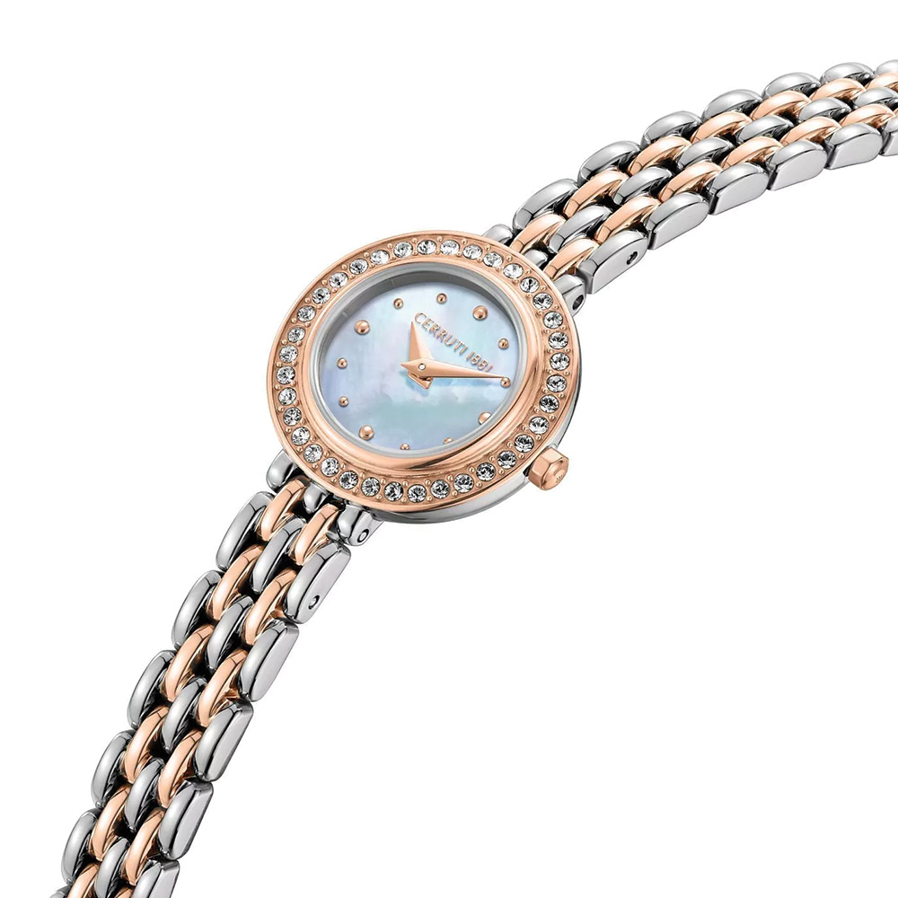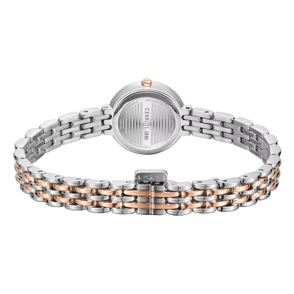 This Cerruti 1881 Matera women’s watch features a refined white mother-of-pearl dial that adds a soft, luminous elegance to its design. The 30mm round stainless steel case in a stylish silver and gold-tone finish creates a balanced and versatile look. Complemented by a matching two-tone stainless steel bracelet, it offers both durability and comfort. Protected by scratch-resistant sapphire glass and powered by a reliable quartz movement, this watch is water resistant up to 3 ATM, making it perfect for everyday elegance.