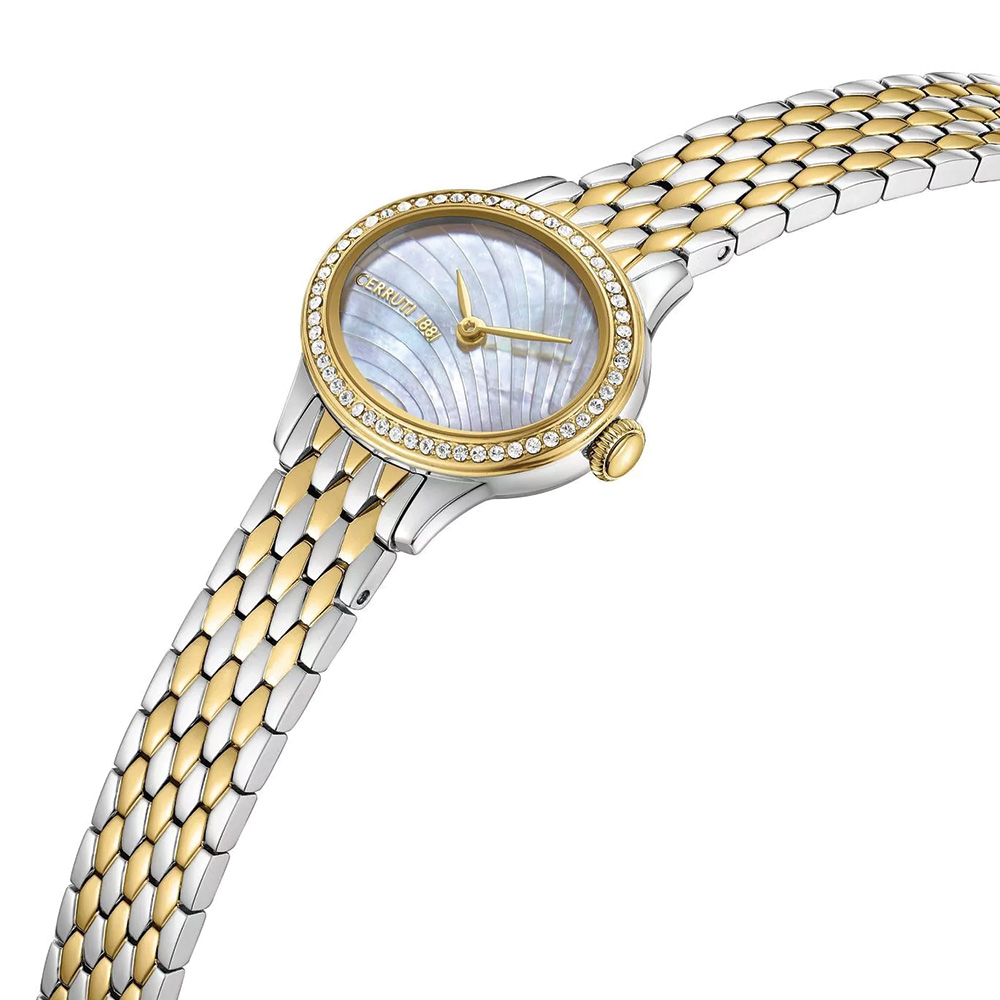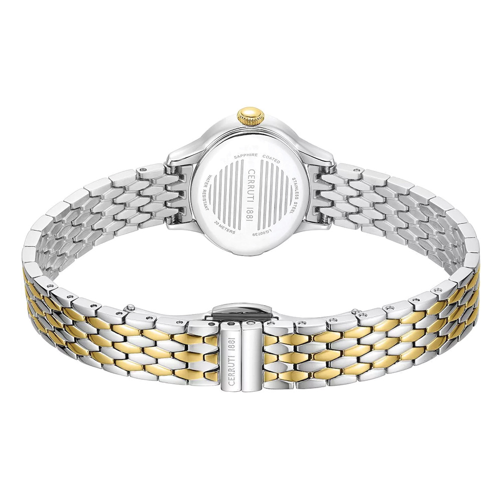 This Cerruti 1881 Nemi women’s watch features a soft beige mother-of-pearl dial that adds a subtle shimmer and refined elegance. The 26mm oval stainless steel case enhances its delicate and feminine appeal, perfectly complemented by a sleek silver-tone bracelet. Crafted with a brass strap and protected by sapphire-coated mineral glass, it offers both durability and style. Powered by a reliable quartz movement and water resistant up to 3 ATM, this watch is ideal for everyday wear with a touch of luxury.