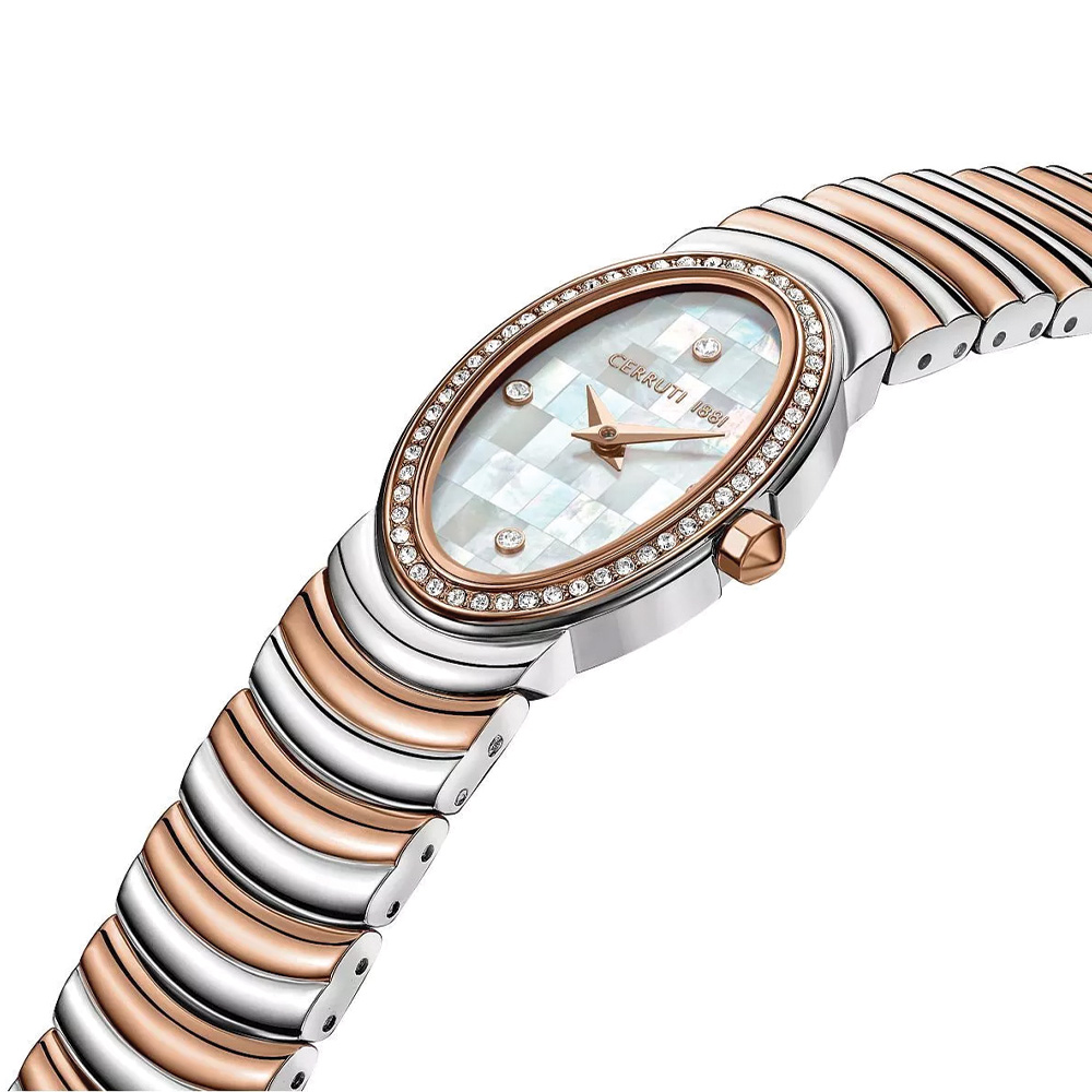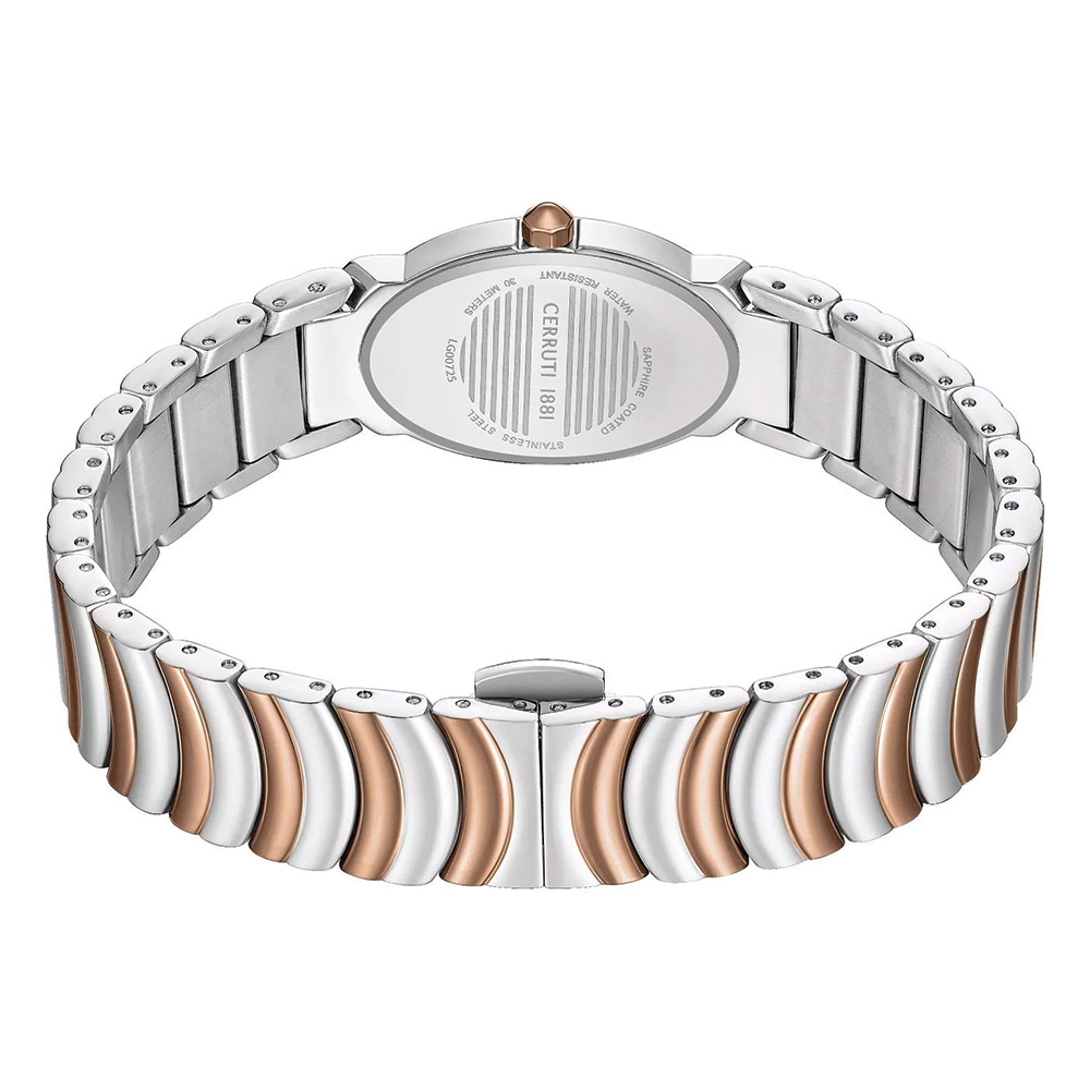 This Cerruti 1881 Norcia women’s watch features a luminous white mother-of-pearl dial that enhances its elegant and timeless appeal. The 39mm oval stainless steel case provides a bold yet feminine presence, complemented by a stylish two-tone silver and gold brass bracelet. Protected by durable mineral glass and powered by a reliable quartz movement, this watch ensures both functionality and sophistication. With water resistance up to 3 ATM, it is suitable for everyday wear while maintaining a luxurious look.