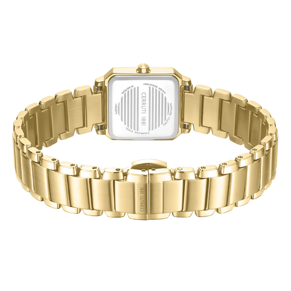This Cerruti 1881 Perugia women’s watch features a striking green dial set within a refined rectangular gold-tone stainless steel case. Accented with zirconia detailing, it adds a touch of luxury and brilliance to its elegant design. The compact 22 x 29 mm case offers a delicate and feminine fit, while the gold stainless steel bracelet enhances its premium appeal. Powered by a reliable quartz movement and protected by mineral glass, this watch is water resistant up to 3 BAR, making it suitable for everyday sophistication.
