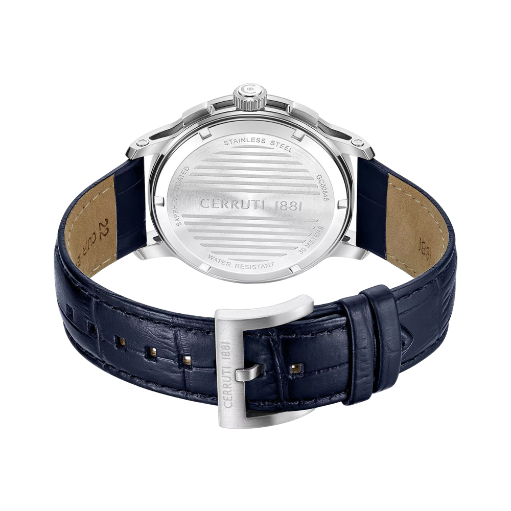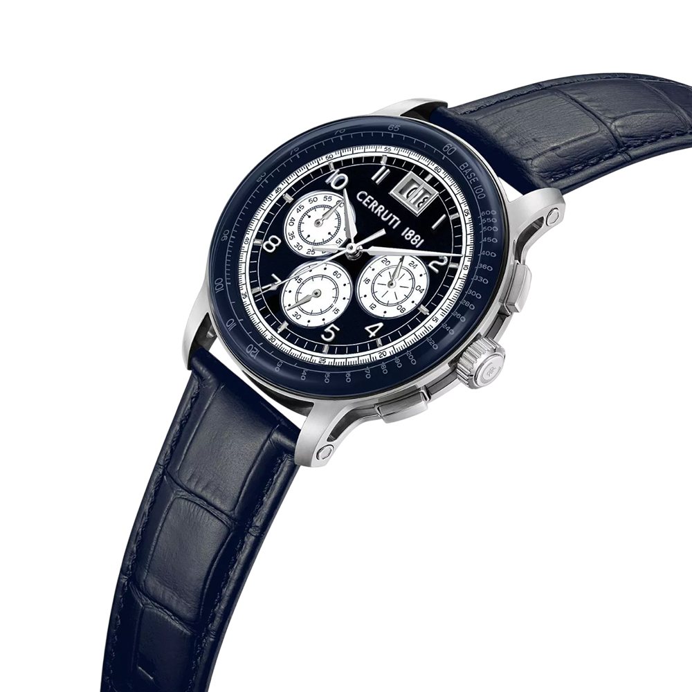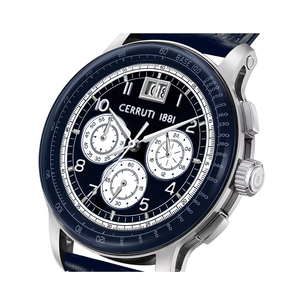 The Cerruti 1881 Petroio is the ultimate choice for men combining an elegant finish and sporty spirit. Featuring a robust chronograph design, silver stainless steel case, and black leather strap, it is powered by precise quartz movement. This 43 mm timepiece includes water resistance up to 30 meters, providing practical elegance for every occasion and a striking chronograph dial for enhanced styling.