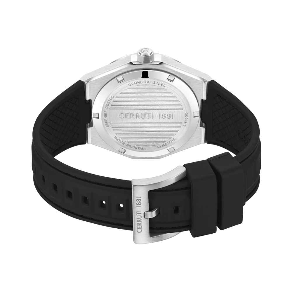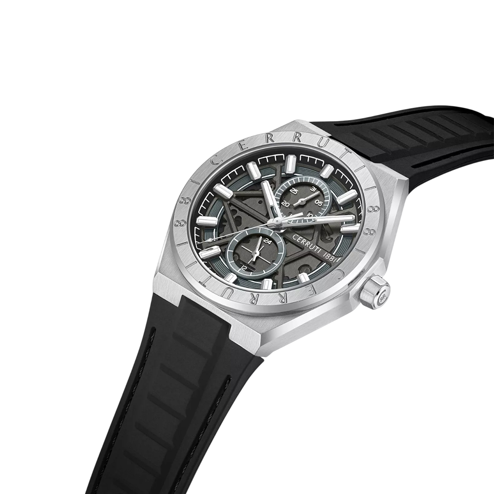 This timepiece from the Ravello collection is a stylish accessory that balances modern design with practical features. It has a steel, silver-colored envelope (case) with a transparent element that allows you to observe the inner workings of the quartz movement. The gray skeleton dial, protected by mineral glass, includes a date pad and a 24-hour time display. The comfortable black rubber strap adds a sporty edge. With 50 meters of water resistance, this watch is a versatile choice for everyday wear and special occasions.