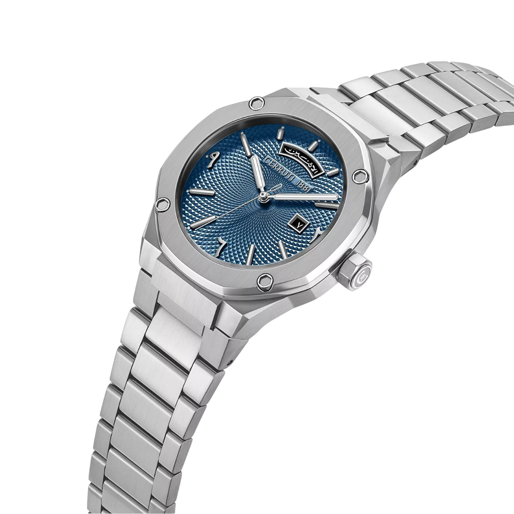This elegant timepiece from the Razzuolo collection combines modern Italian style with daily practicality. It features a deep blue analog dial protected by sapphire-coated mineral glass for enhanced scratch resistance. The 41mm stainless steel case and integrated silver-tone bracelet provide a seamless and professional look. Powered by a reliable quartz movement and offering 50 meters of water resistance, this watch is designed for the modern gentleman who values refined elegance in his everyday accessories.