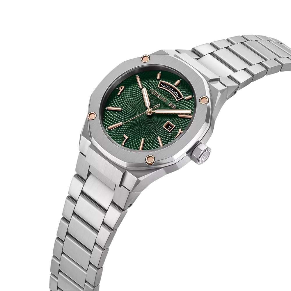 This elegant timepiece from the Razzuolo collection combines modern Italian style with daily practicality. It features a deep green analog dial protected by sapphire-coated mineral glass for enhanced scratch resistance. The 41mm stainless steel case and integrated silver-tone bracelet provide a seamless and professional look. Powered by a reliable quartz movement and offering 50 meters of water resistance, this watch is designed for the modern gentleman who values refined elegance in his everyday accessories.