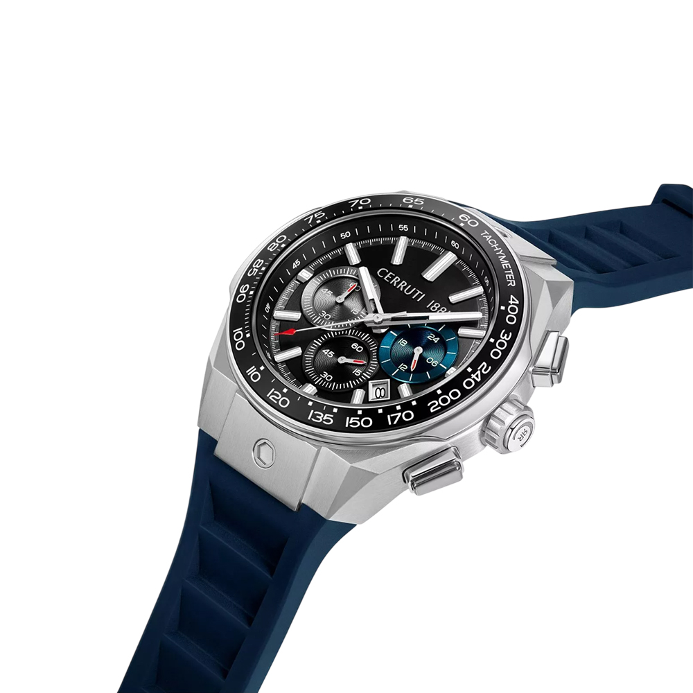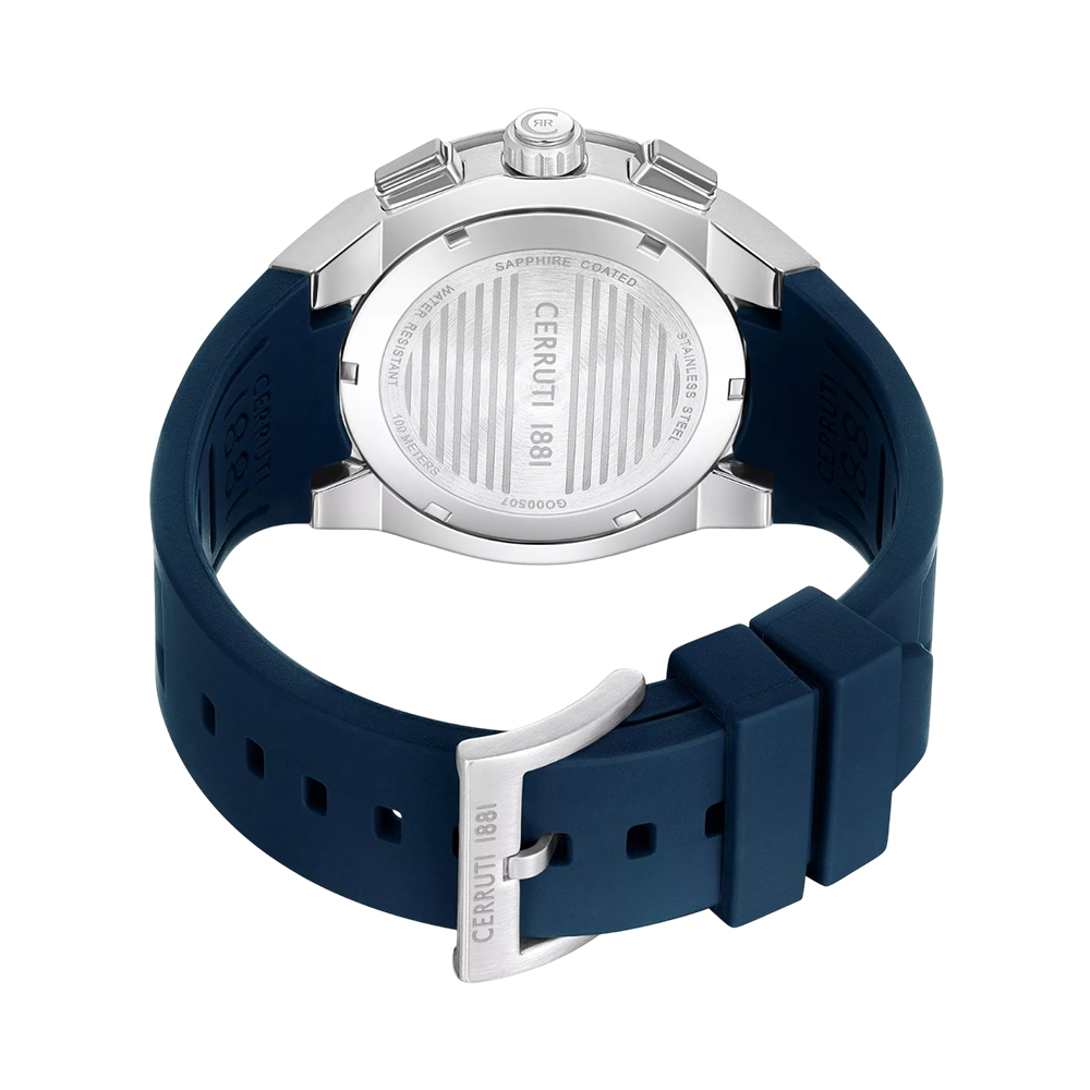 This timepiece combines functionality with an attractive modern design. The solid 46mm silver-toned stainless steel case frames a crisp black dial protected by durable mineral glass. Powered by a reliable quartz movement, the intense blue silicone strap adds a sporty style and ensures comfortable wear. With 50 meters of water resistance, this watch is an ideal choice for men who appreciate practicality, modern aesthetics, and the Italian elegance of CERRUTI 1881.