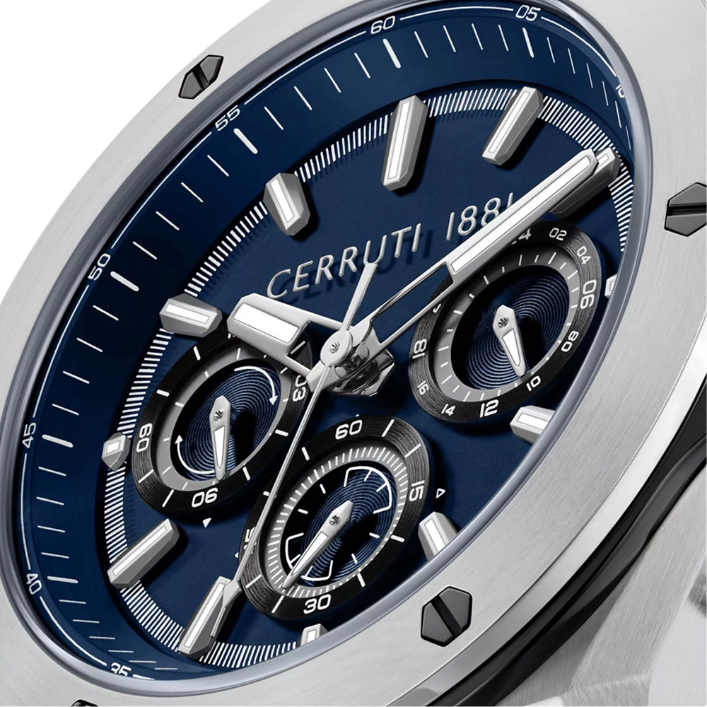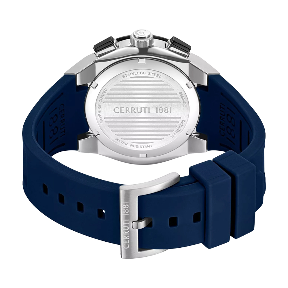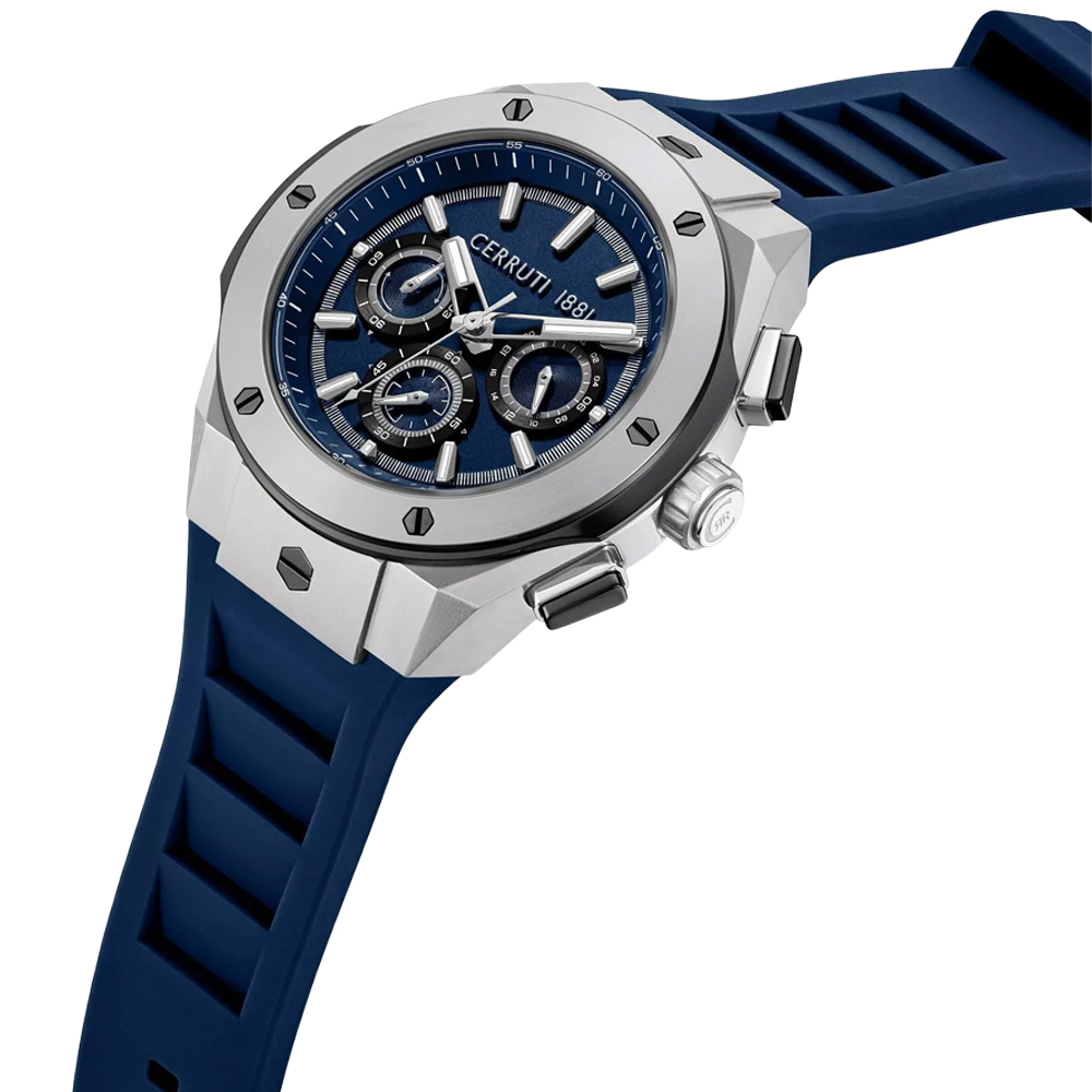 The CERRUTI 1881 Ruscello Men’s Watch CIWGQ0085602 is designed for modern men who appreciate a bold yet versatile timepiece. It features a durable 44 mm stainless steel case paired with a striking blue dial protected by mineral crystal for enhanced durability and clarity. Powered by precise quartz movement, the watch ensures accurate and low-maintenance timekeeping. The flexible blue silicone strap provides all-day comfort and a secure fit, making it perfect for work, travel, and casual outings. With water resistance up to 50 metres, it is suitable for everyday splashes and handwashing, offering a perfect balance of sporty comfort and refined style.