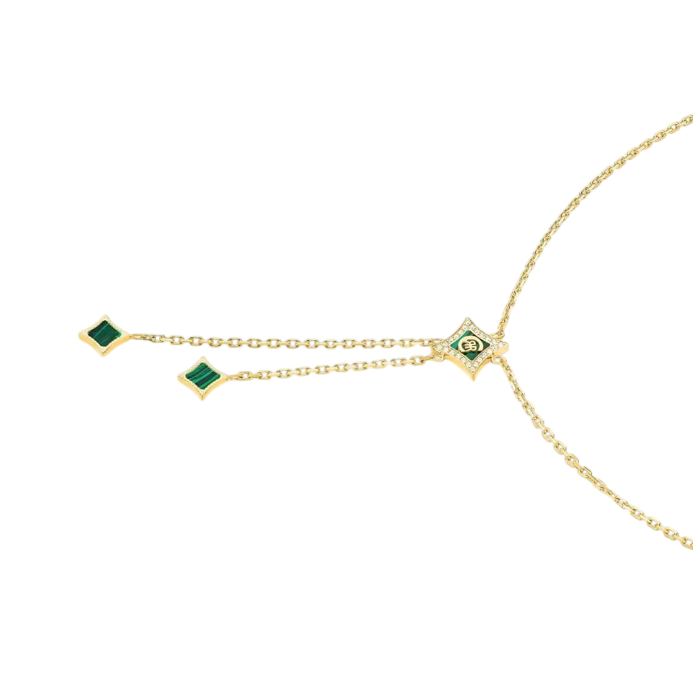 The CERRUTI 1881 Silvia Necklace CIJLN0012605 is a luxurious and expressive CERRUTI accessory that captures the essence of modern Parisian elegance. It features a high-quality gold-plated stainless steel chain that leads to a bold, diamond-shaped green malachite pendant. The natural patterns of the malachite are beautifully highlighted by a border of sparkling crystals, creating a sophisticated contrast of textures. Designed with a stylish Y-profile, this CERRUTI necklace adds a statement touch to the neckline, making it a perfect choice for women who appreciate refined, nature-inspired jewelry.