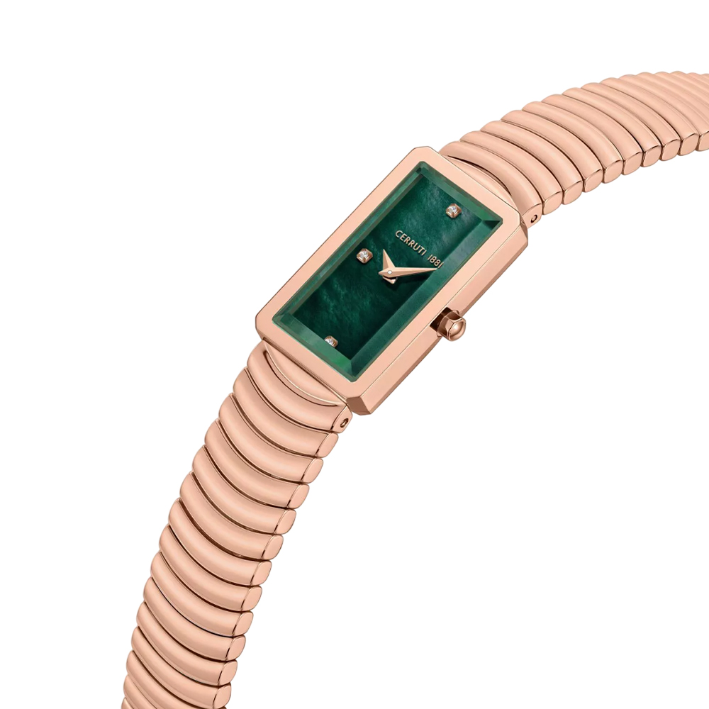 Cerruti 1881 Vallucciole features a dainty 17mm rose gold stainless steel case, quartz movement, and refined white mother-of-pearl dial. Designed for subtle elegance, this 5 ATM water-resistant watch adds a distinct touch of sophistication to day and night looks.