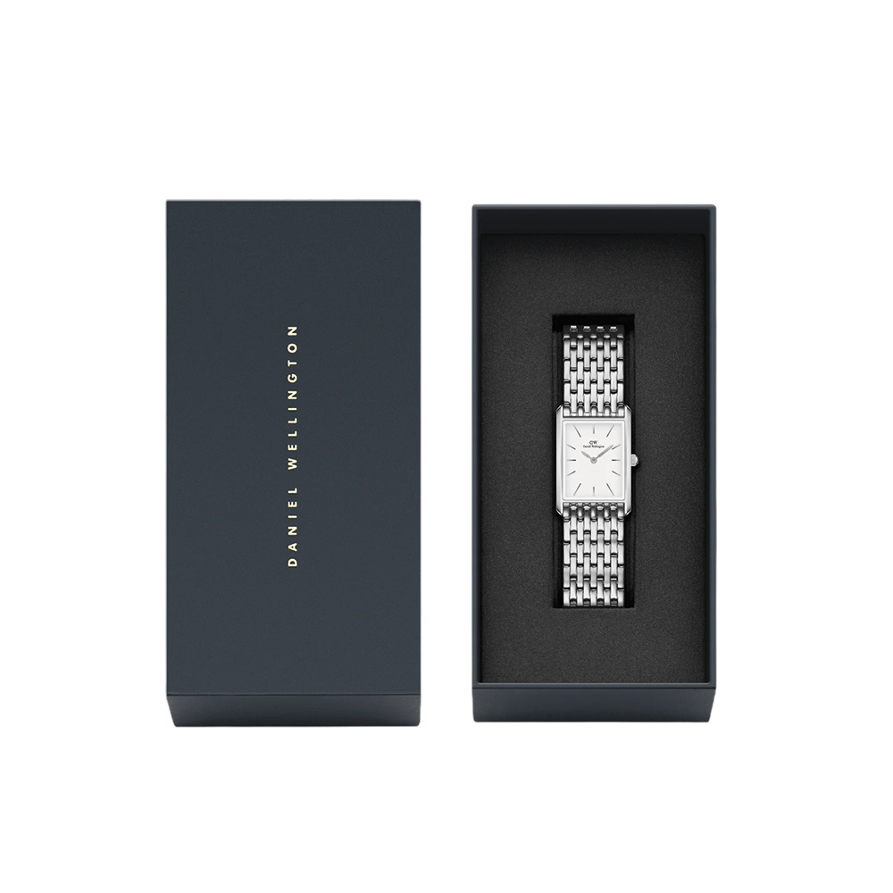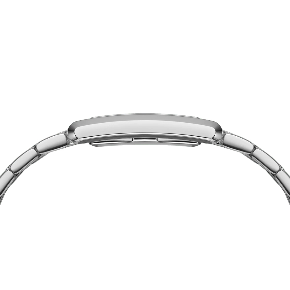 This timepiece from the Bound collection brings perfect symmetry to the wrist with its elegant geometric design. The curved rectangular 316L stainless steel case matches the exact width of its 9-link strap, creating a flowing, integrated aesthetic. It features a crisp white analog dial powered by a reliable Japanese quartz movement. With 3 ATM water resistance and a comfortable adjustable length (135-185mm), this watch is a statement of modern minimalism.