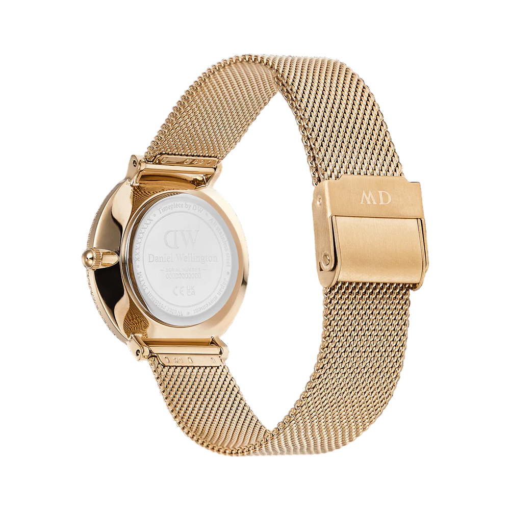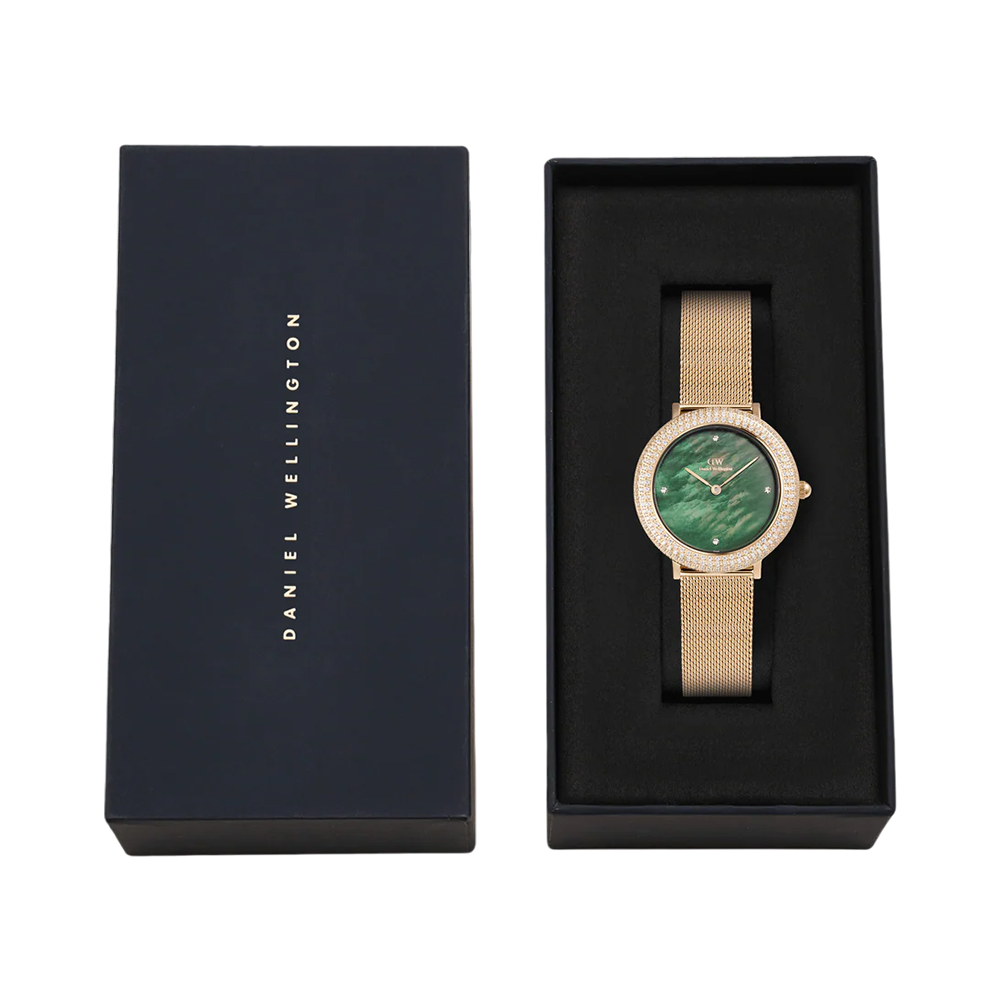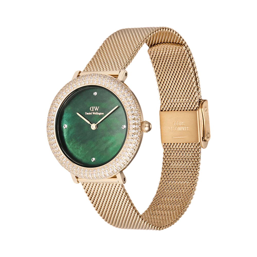 The Daniel Wellington Crystalline Bezel Evergold Green watch DW00100824 features a 32 mm gold-tone stainless steel case adorned with a bezel set with 262 crystals and a striking green mother-of-pearl dial. It is paired with a fine gold mesh strap that is spring-bar attached and offers interchangeable strap options. Powered by reliable Japanese quartz movement and suitable for rain and splash exposure (3 ATM water resistance), this elegant woman's timepiece adds sparkle and sophistication to everyday wear or special occasions.