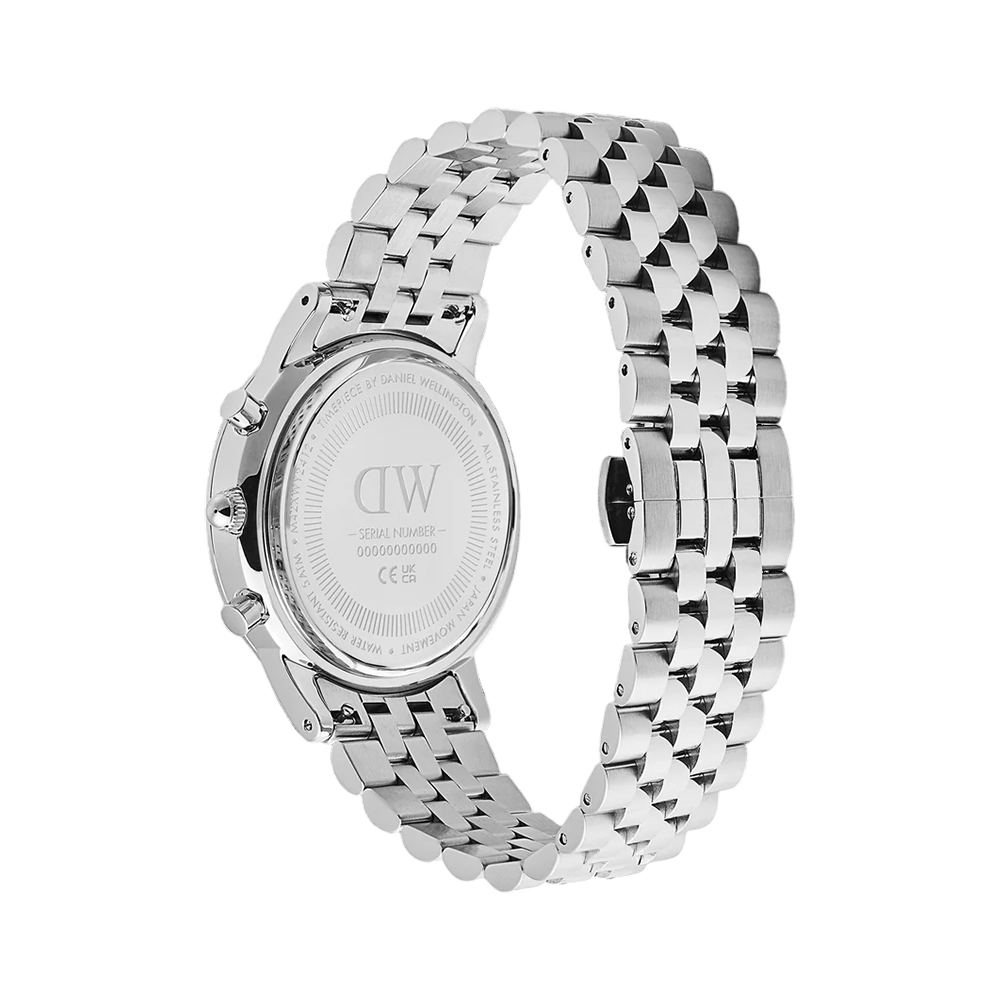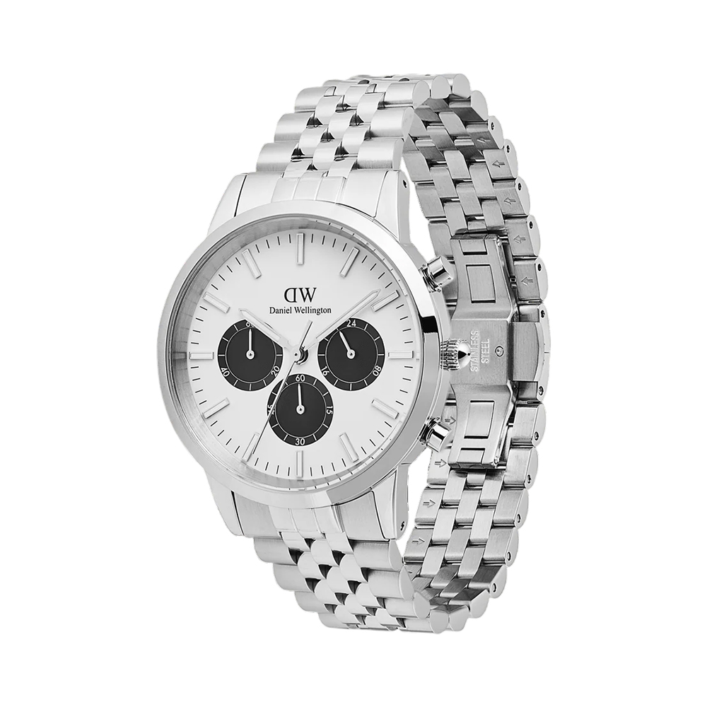 The Daniel Wellington Iconic Arch DW00100872 is a sporty, modern chronograph featuring a 42 mm stainless steel case, an off-white “panda” style dial with sub-dials, and a 5-link polished metal bracelet. It offers water resistance up to 50 m (5 ATM), suitable for everyday exposure to water such as washing hands or light water contact.