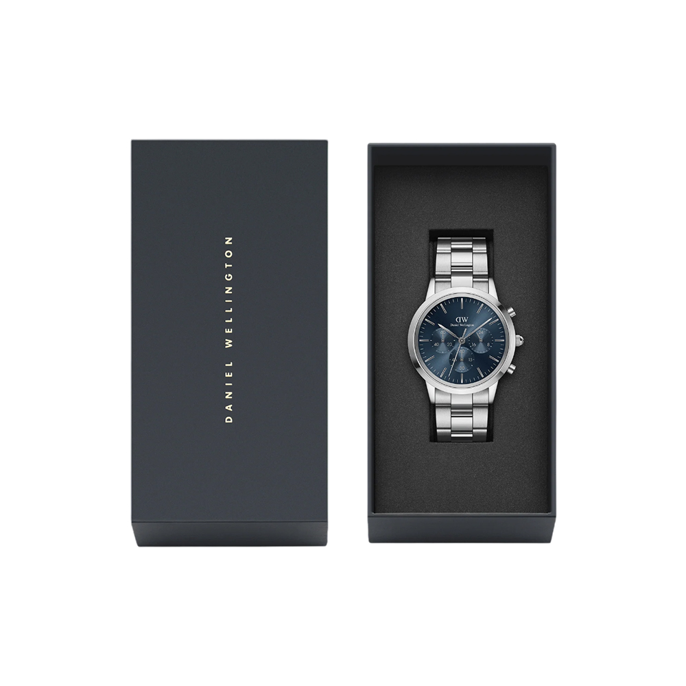 This Daniel Wellington masterpiece from the Iconic collection seamlessly integrates classic chronograph utility with minimalist design. The 42mm 316L stainless steel case houses a striking Arctic blue sunray dial equipped with three sub-dials for multiple stopwatch functionalities and flawless precision. Powered by a Japanese quartz movement, this Daniel Wellington watch features an innovative interchangeable link strap system that allows for tool-free replacement. With 5 ATM water resistance, this Daniel Wellington timepiece offers a bold yet refined aesthetic that perfectly balances 80s-inspired flair with modern silver-toned elegance.
