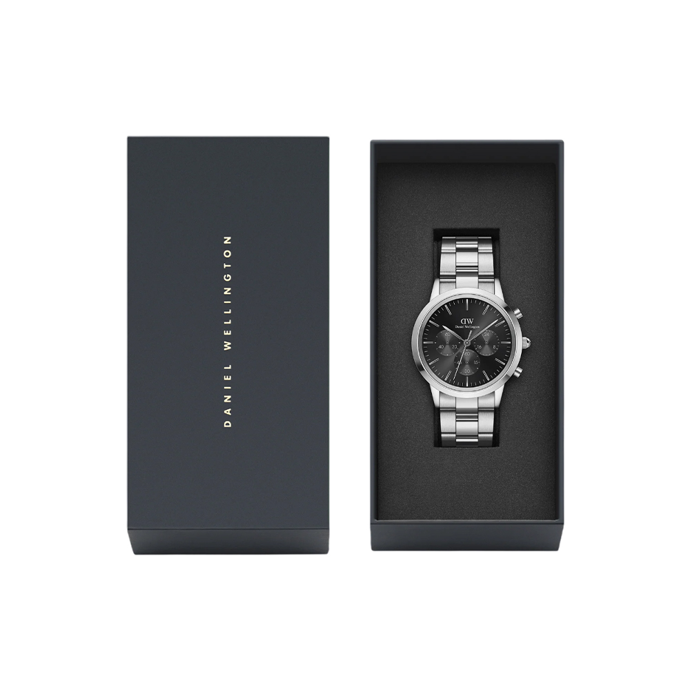 This timepiece from the Iconic collection seamlessly integrates classic chronograph utility with modern minimalist design. The 42mm 316L stainless steel case houses a striking black sunray dial equipped with three sub-dials for multiple stopwatch functionalities and flawless precision. Powered by a reliable Japanese quartz movement, it features an innovative quick-release, interchangeable silver-toned link strap system that offers both comfort (130-210mm adjustable length) and style versatility. With 5 ATM water resistance, this watch is a bold yet refined accessory.