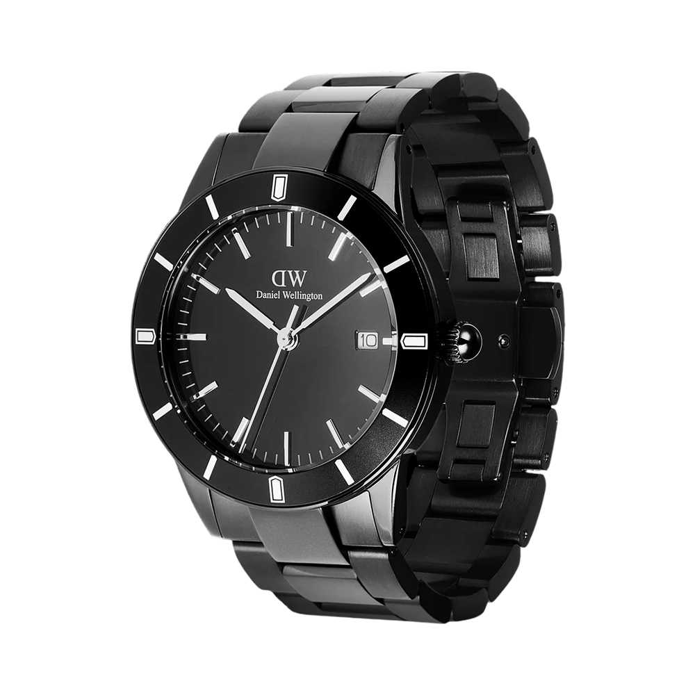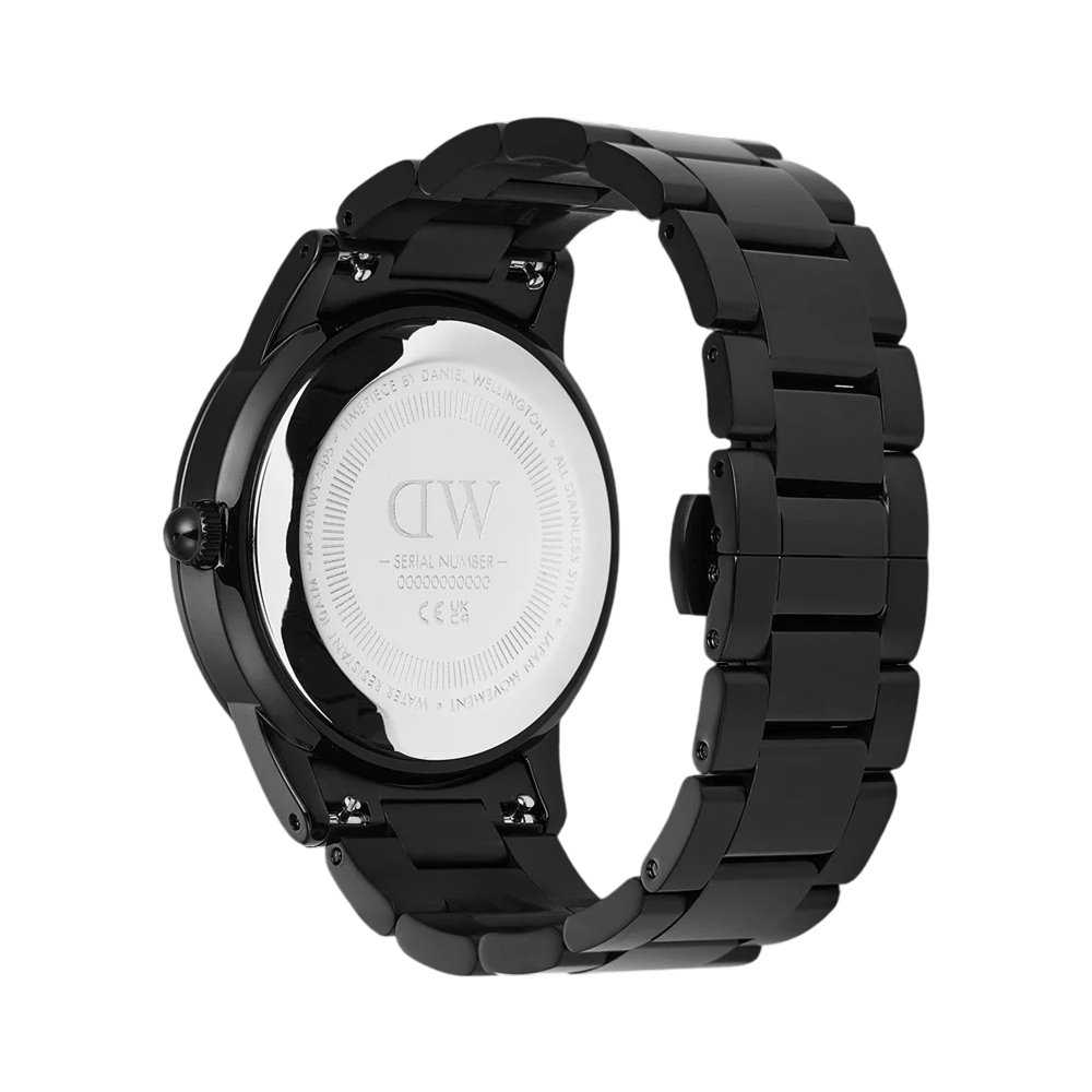 The Daniel Wellington Iconic Paradigma Link Black DW00100821 features a 40 mm stainless steel case with a black bezel and matching black dial, combined with a three-link stainless steel bracelet. It offers robust water resistance up to 10 ATM, making it suitable for swimming. The strap uses a quick-release butterfly clasp with push-button release, offering secure and refined wear.