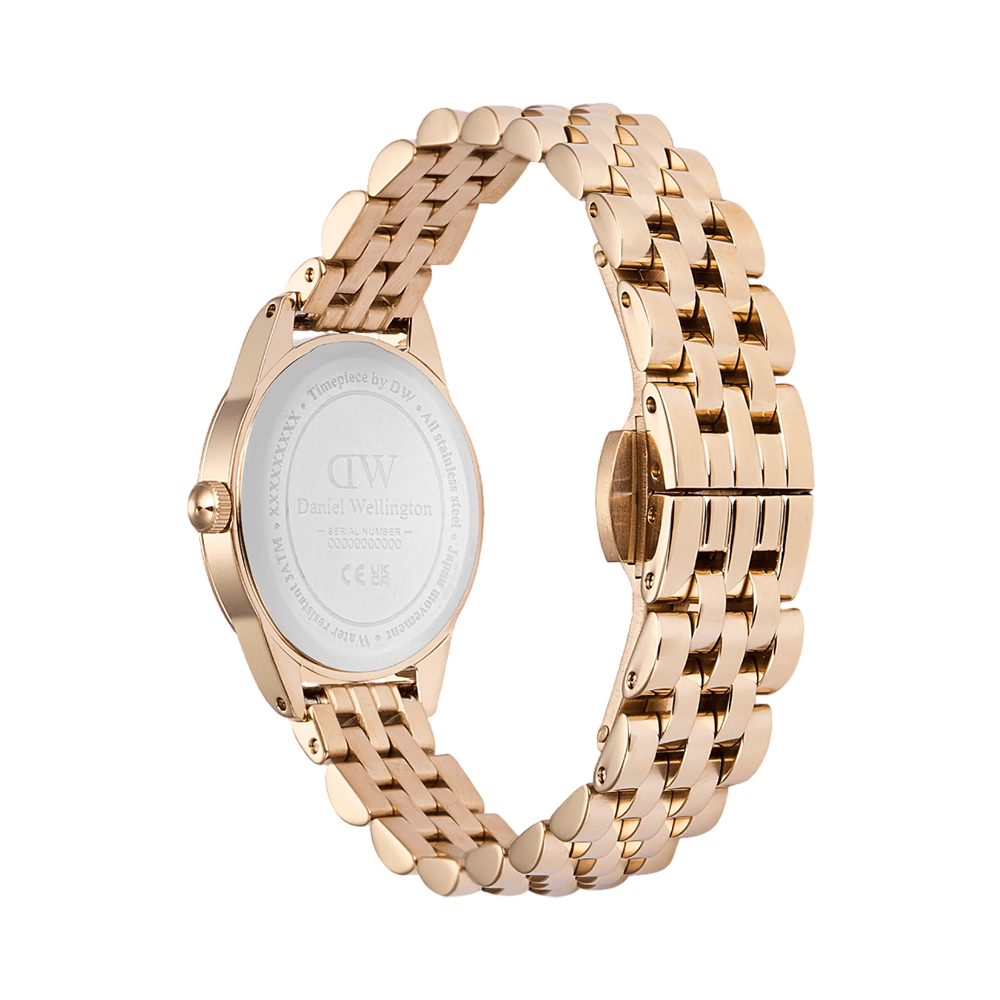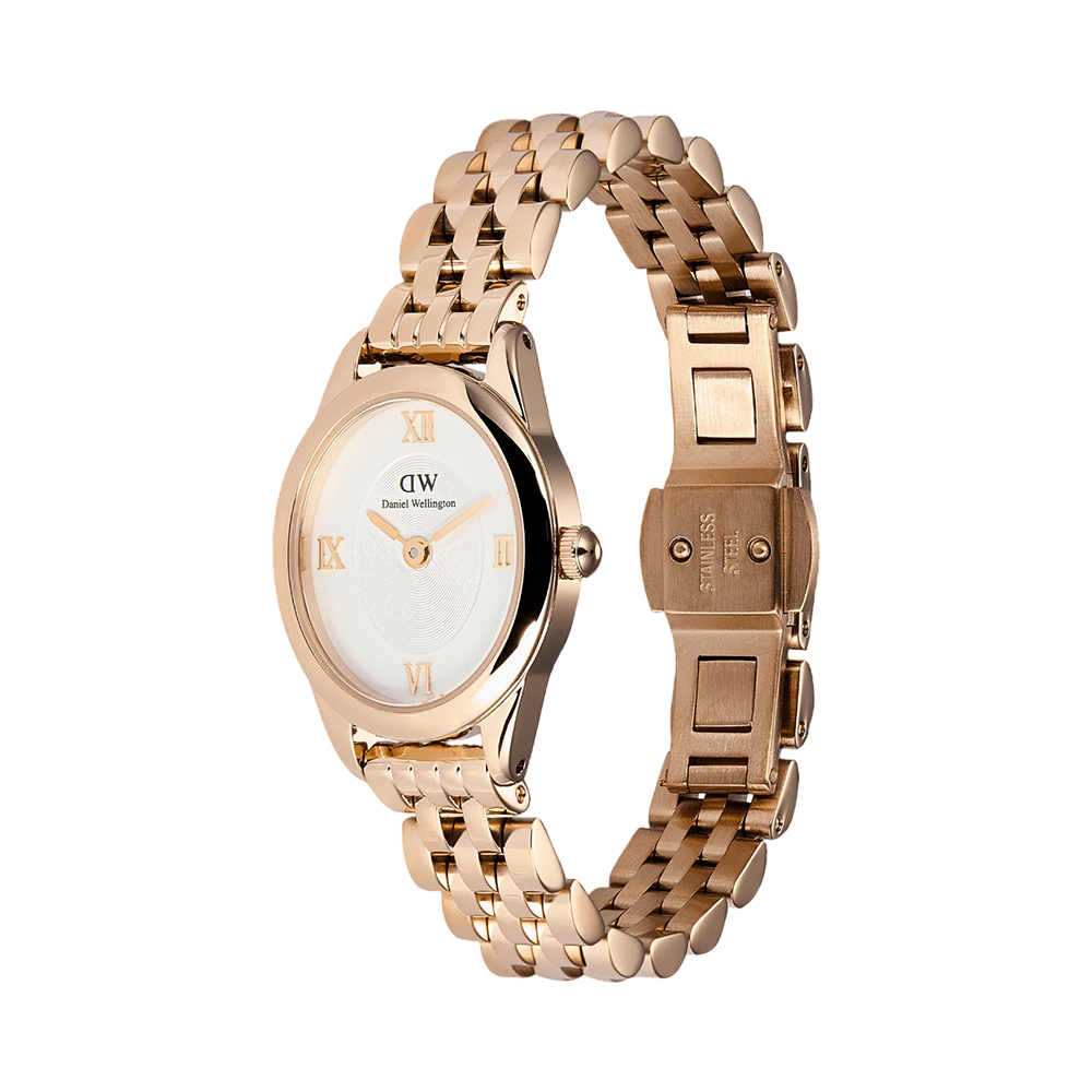 The Daniel Wellington Ophelia Mini Rose Gold DW00100805 features a polished stainless steel case in rose-gold PVD with an elegant oval shape (size ~22 × 25.5 mm) and a 5-link stainless steel bracelet. It is powered by a precise quartz movement and is water resistant up to 3 ATM for rain and splash protection. The watch combines minimalist design with refined craftsmanship, making it perfect for women seeking timeless elegance.