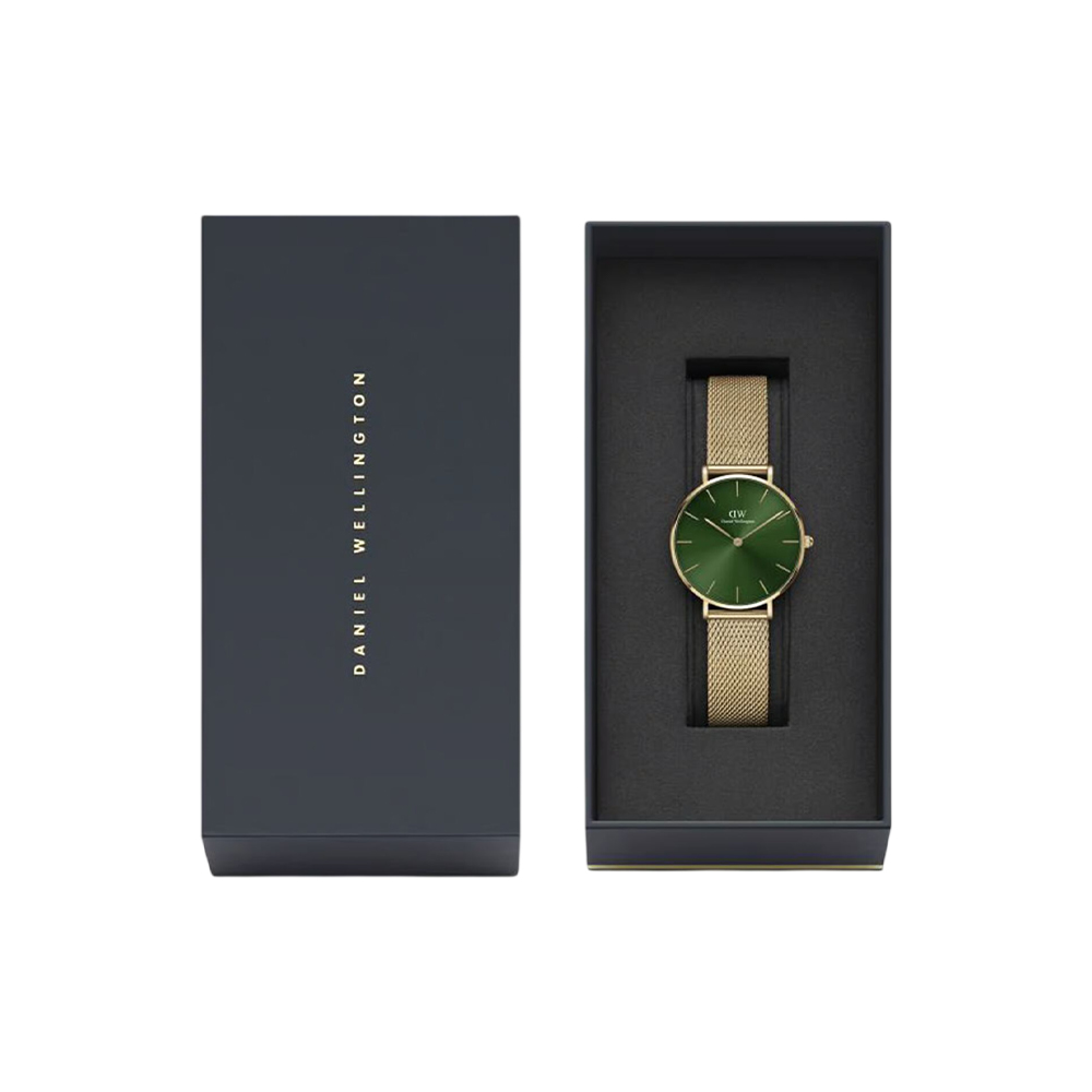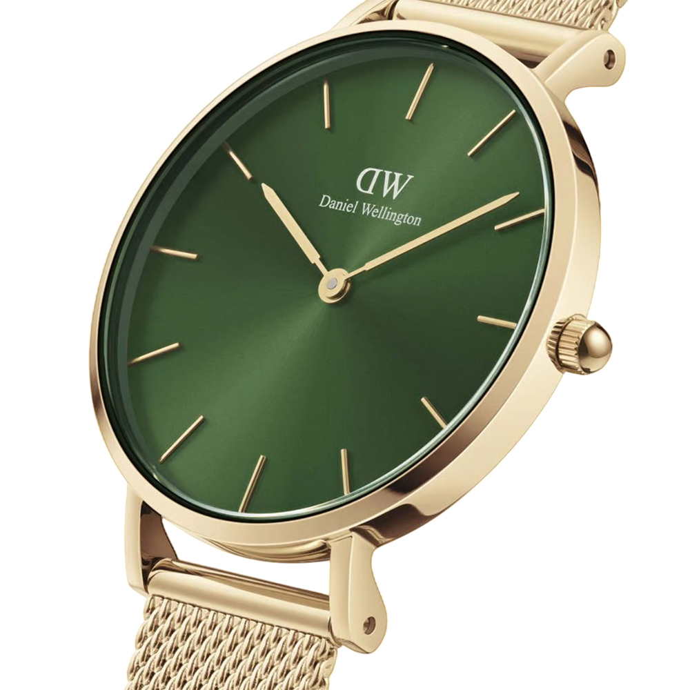 This skillfully designed timepiece from the Petite Emerald collection offers effortless style. It features a minimalist green dial with stick indices protected by durable mineral glass and powered by a precise two-hand quartz movement. The refined gold-plated stainless steel mesh bracelet provides a comfortable and secure fit with an adjustable hook buckle clasp. With 30m water resistance, this watch is ideal for adding a touch of sophisticated color to any daily outfit.