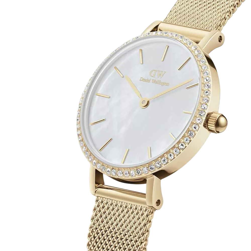 This elegant timepiece is designed for ladies who appreciate subtle yet striking accessories. It features a genuine multicolor mother-of-pearl dial housed within a 6mm thin 316L stainless steel case. The fixed bezel is adorned with shimmering zircons that catch the light beautifully, while the gold-toned stainless steel mesh strap ensures a comfortable and stylish fit. Powered by a precision quartz movement and offering 30m water resistance, this watch is ideal for both special occasions and everyday elegance.