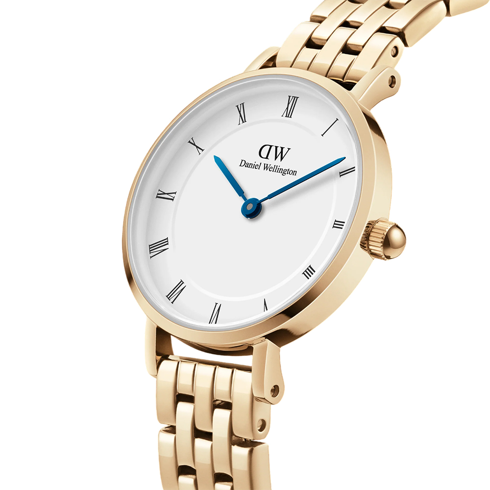 This timepiece strikes the perfect balance between vintage-inspired design and modern trends. It features a classic white dial with elegant Roman numeral indices and distinctive blue steel hands, housed within a slender 6mm case and powered by a reliable Japanese quartz movement. The 316L stainless steel 5-link bracelet, with gold PVD plating, provides a luxurious and comfortable fit. With 3 ATM water resistance and interchangeable strap compatibility, this watch is ideal for adding timeless elegance to any ensemble.