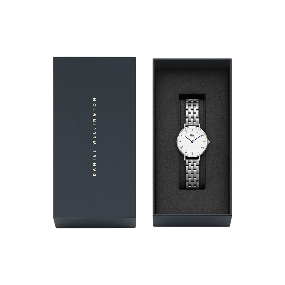 This timepiece strikes the perfect balance between vintage-inspired design and modern trends. It features a classic white dial with elegant Roman numeral indices and distinctive blue steel hands, housed within a slender 6mm case and powered by a reliable Japanese quartz movement. The 316L stainless steel 5-link bracelet provides a luxurious and comfortable fit. With 3 ATM water resistance and interchangeable strap compatibility, this watch is ideal for adding timeless elegance to any ensemble.